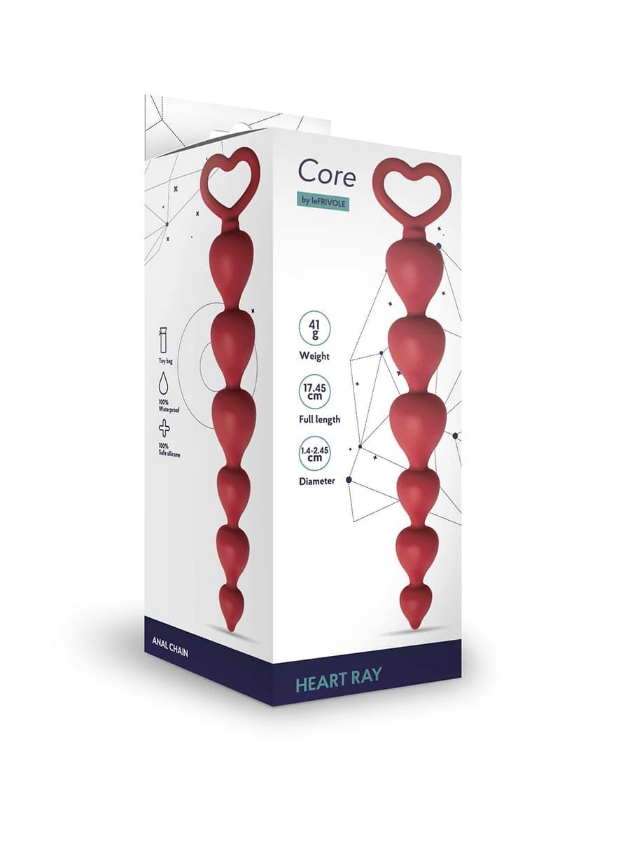 Анальные цепочка Heart Ray из коллекции Core – это новая вершина удовольствия. Изделие состоит из 6 звеньев разных размеров. Гладкая поверхность и разный диаметр шариков позволят вам получить массу наслаждения и пройти все грани удовольствия. Петля в форме сердца способствует комфортному введению и извлечению.
