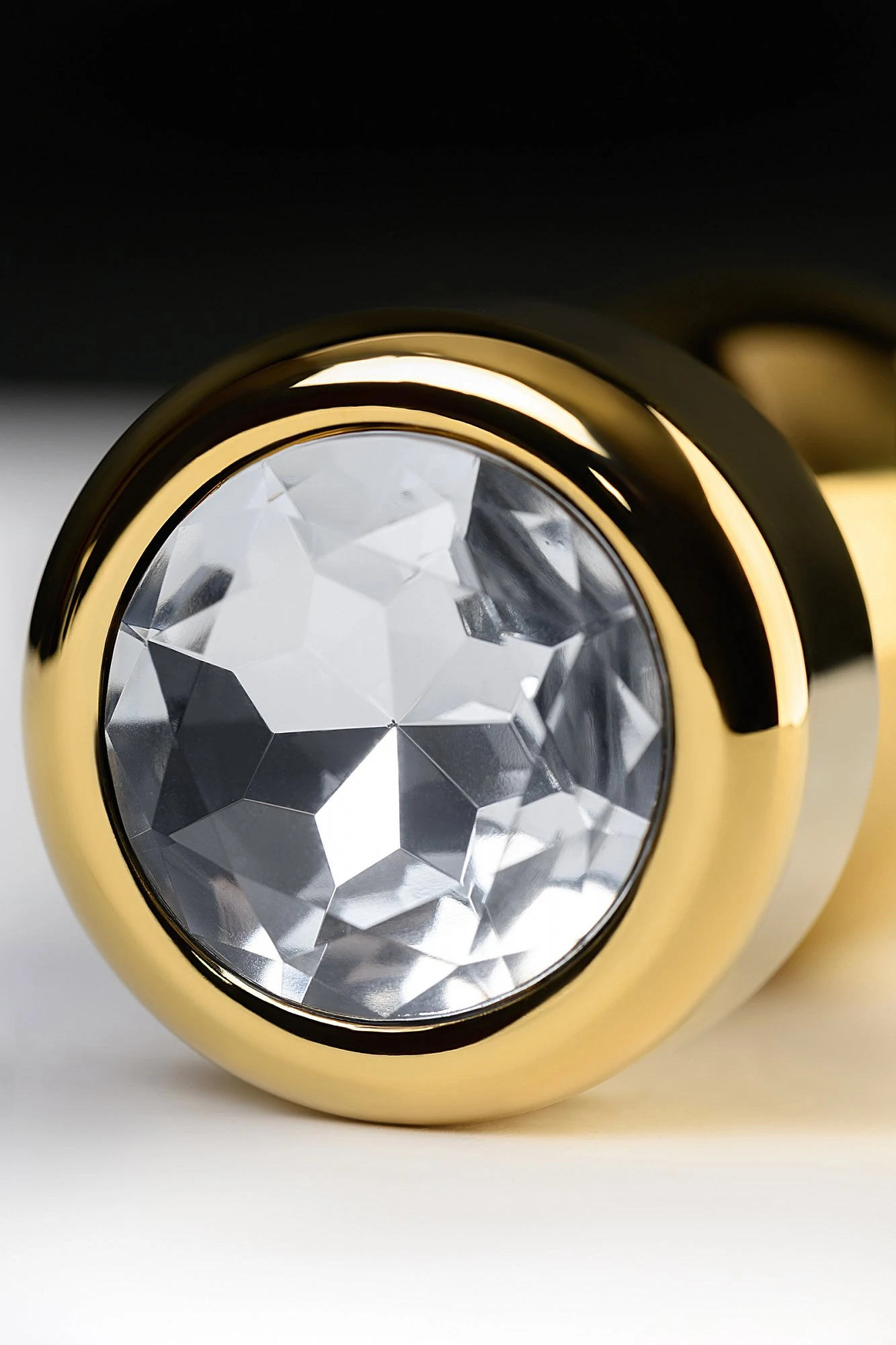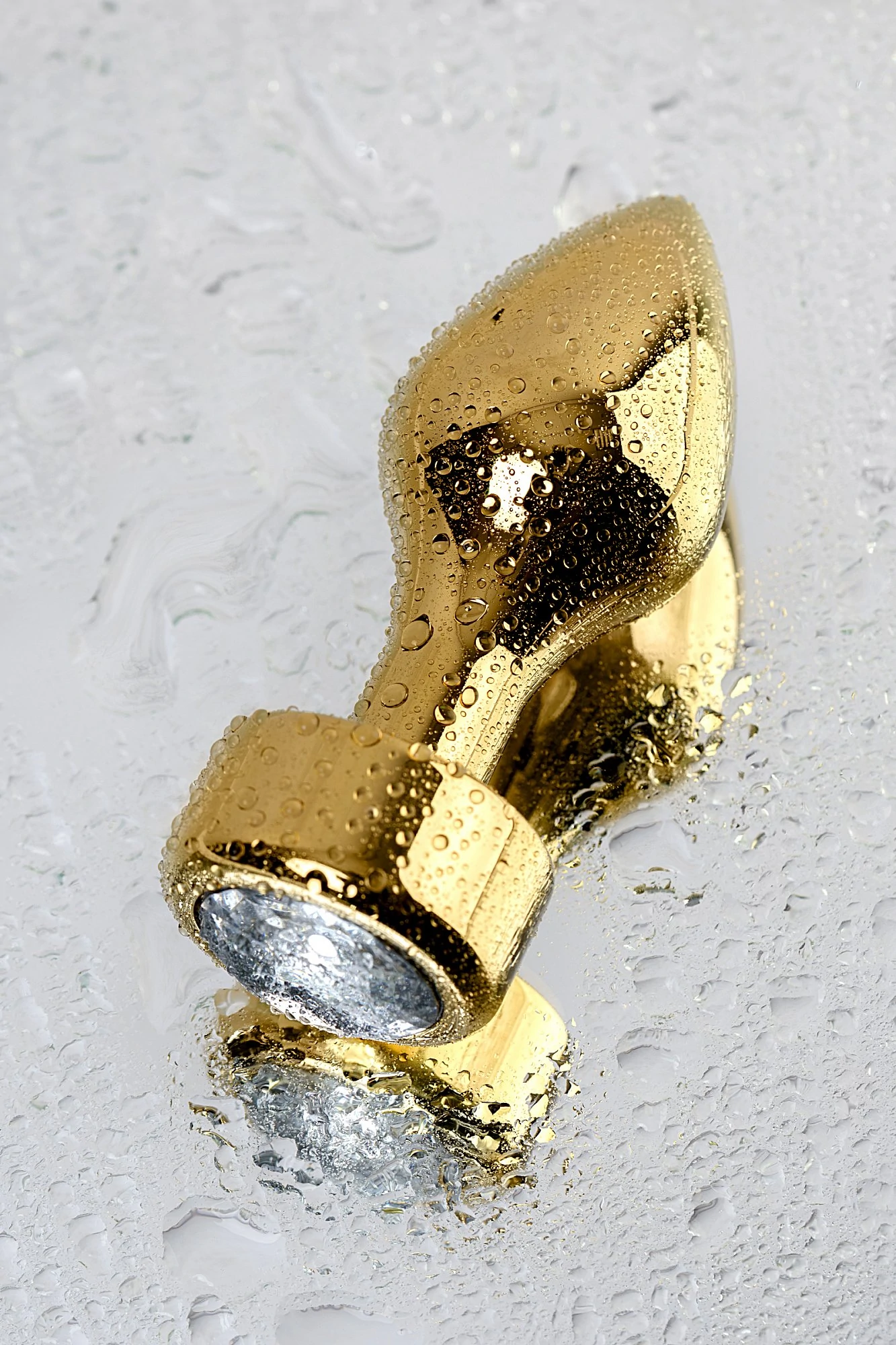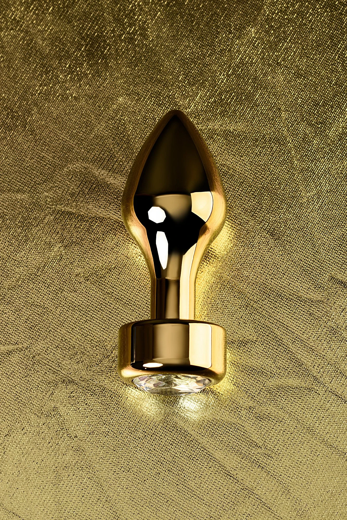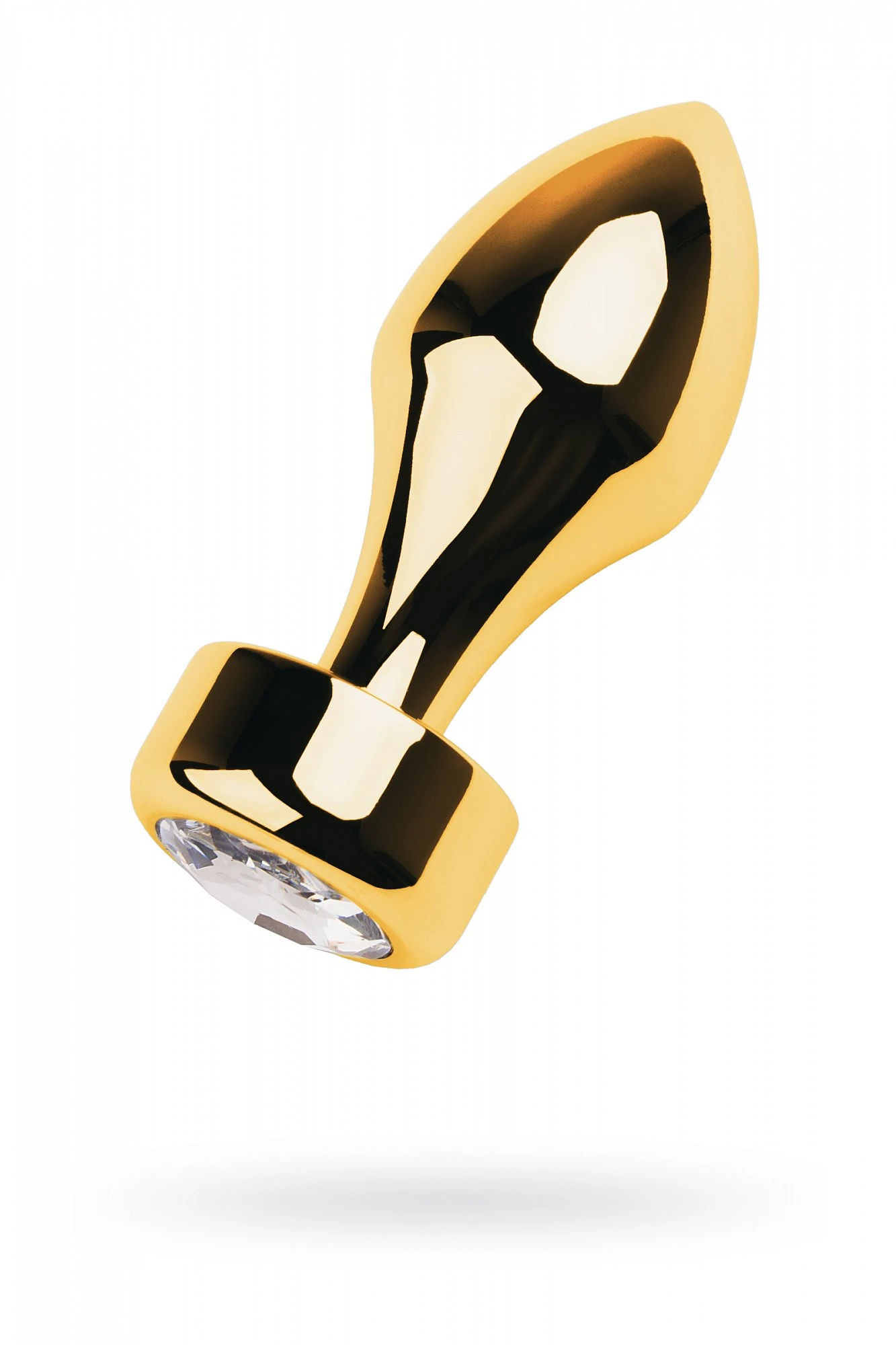 Золотистая втулка-пуля среднего размера со стразом -кристал. Удобно вводится и удерживается внутри. Широкий ограничитель добавляет уверенности в том, что она не войдет слишком глубоко. Вес: 130 гр.