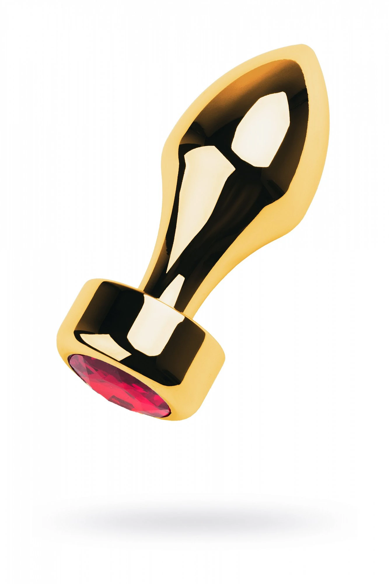 Анальная втулка металл, золотая, с красным кристаллом. Удобно вводится и удерживается внутри. Широкий ограничитель добавляет уверенности в том, что она не войдет слишком глубоко. Размер: общая длина 10.8 см, рабочая длина 8.5 см, диаметр 4 см. Вес 200 гр.