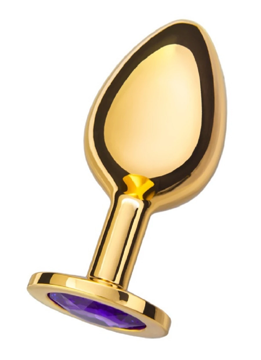 Золотая анальная пробка с шикарным фиолетовым стразом на основании - это изящный способ разнообразить интимные моменты вашей близости. Изготовлена из медицинской стали. Роскошная анальная пробка маленького размера. Благодаря своему весу идеально подходит для тренировки ануса. Размер: общая длина 7 см, рабочая 6 см, диаметр 2,7 см.Цвет: фиолетовый. Для более комфортного использования рекомендуем приобрести смазку на водной или силиконовой основе и очищающий спрей Clear Toy 100 мл для обработки изделия.
