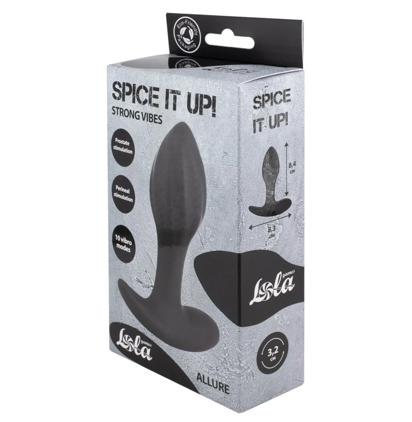 Spice it Up Allure - это водонепроницаемая перезаряжаемая анальная пробка с вибрацией, созданная из невероятно мягкого двухслойного силикона. Мощный и бесшумный мотор с 10 режимами стимуляции и яркий рельеф на поверхности пробки гарантированно подарит удовольствие каждому пользователю. Гибкая ножка обеспечит максимальный комфорт при введении, а благодаря ограничительному основанию эргономичной формы, Allure удобно использовать в течение продолжительного ношения. Размер: длина 10,3 см, рабочая длина 8,4 см, диаметр 3,2 см, длина основания 8,3 см. Цвет: черный. Для более комфортного использования рекомендуем приобрести смазку на водной основе и очищающий спрей Clear Toy 100 мл для обработки изделия.