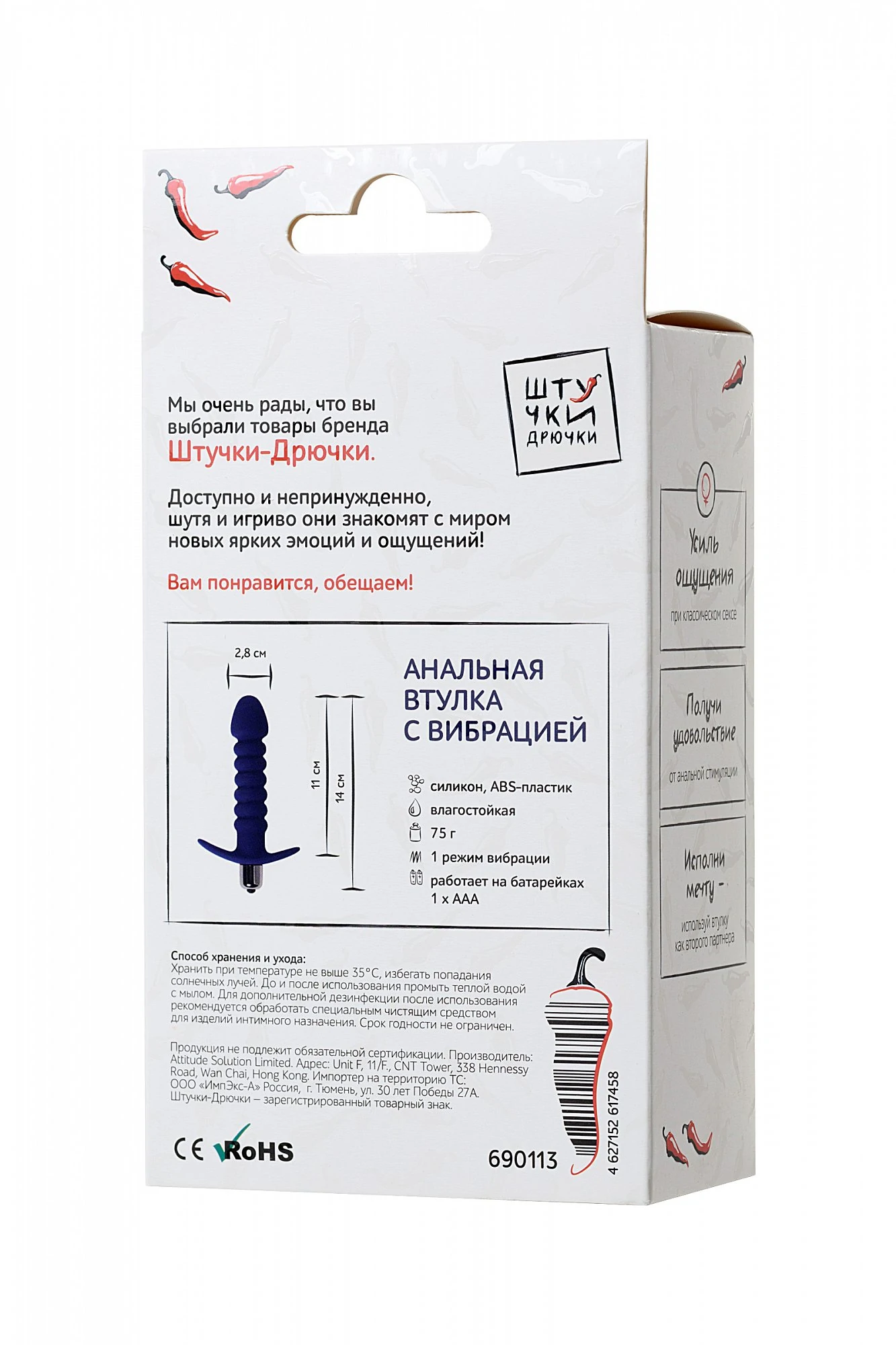 Виброштучка для анальной стимуляции от бренда Штучки-Дрючки. Игрушка наполняет изнутри, а вибрация доставляет удовольствие каждой клеточке тела. Рельефный ствол обеспечивает дополнительную стимуляцию. Широкий ограничитель не позволит втулке проникнуть дальше необходимого. Съемная вибропуля работает от 1×ААА батарейки (в комплекте). Количество режимов вибрации 1, количество скоростей 1. Размер: общая длина 14 см, рабочая длина 11,5 см, диаметр 2,5 - 2,8 см.
