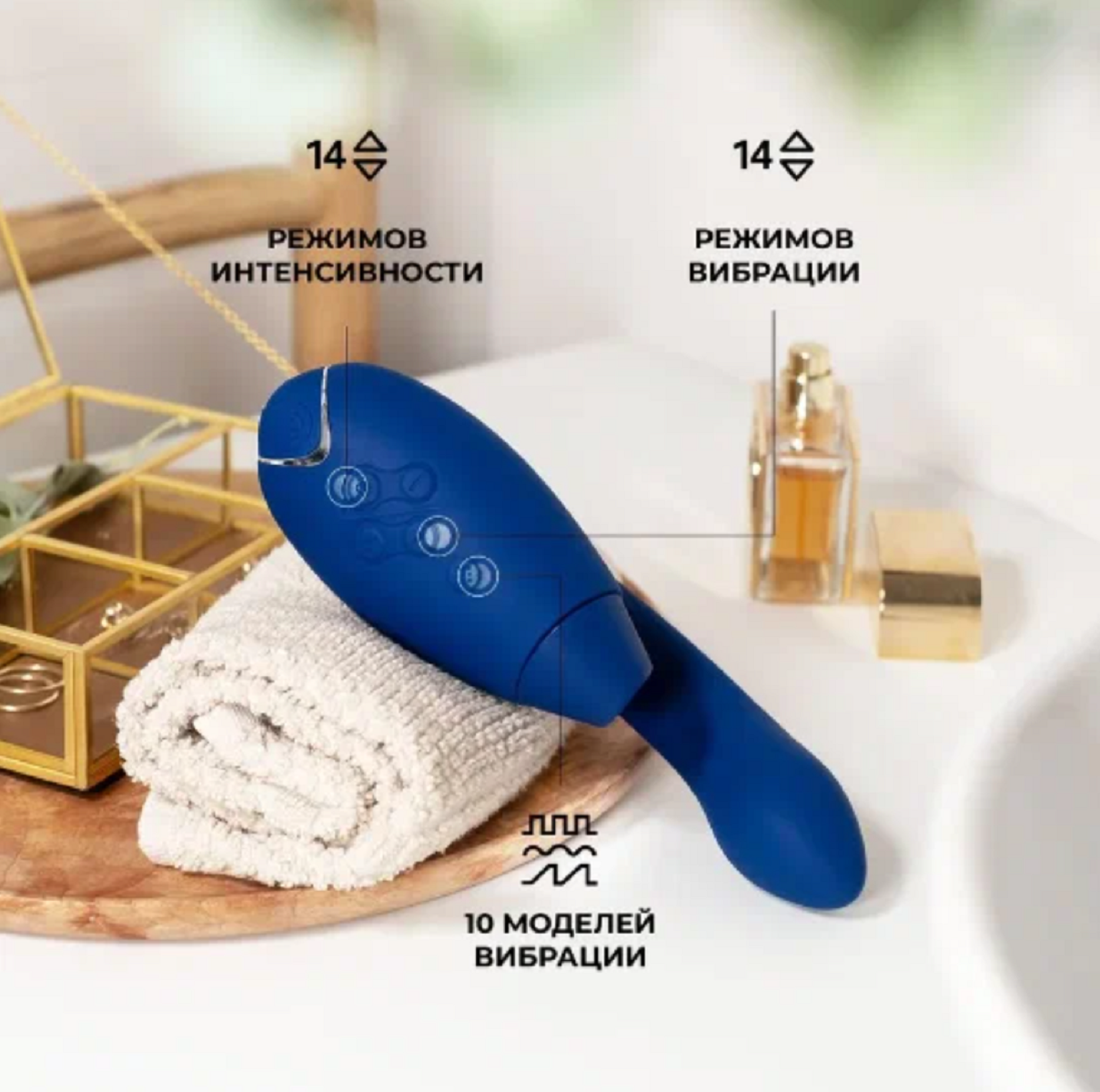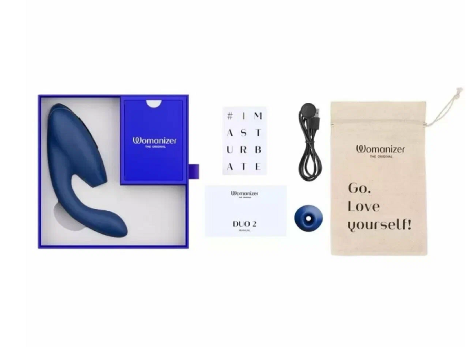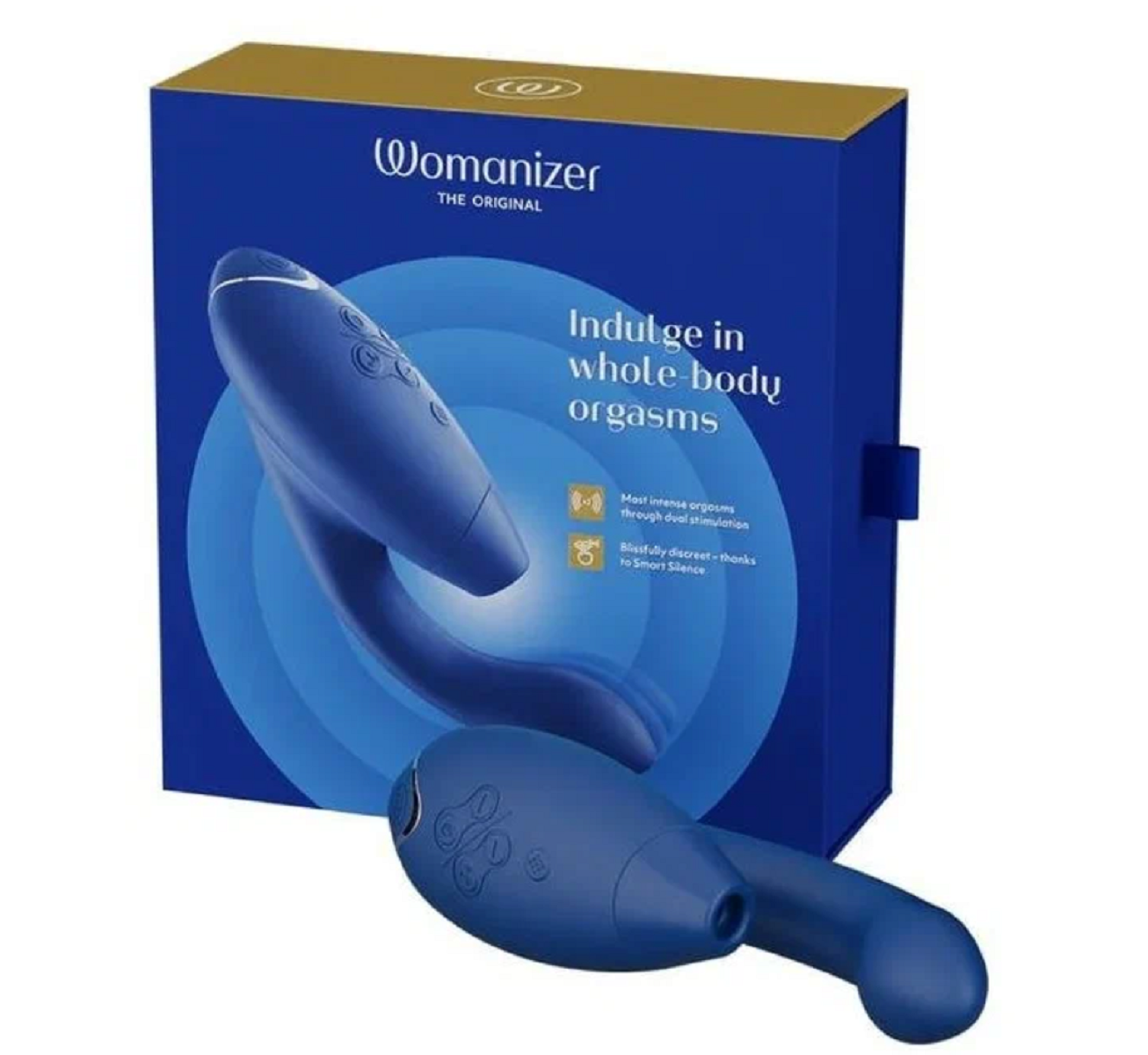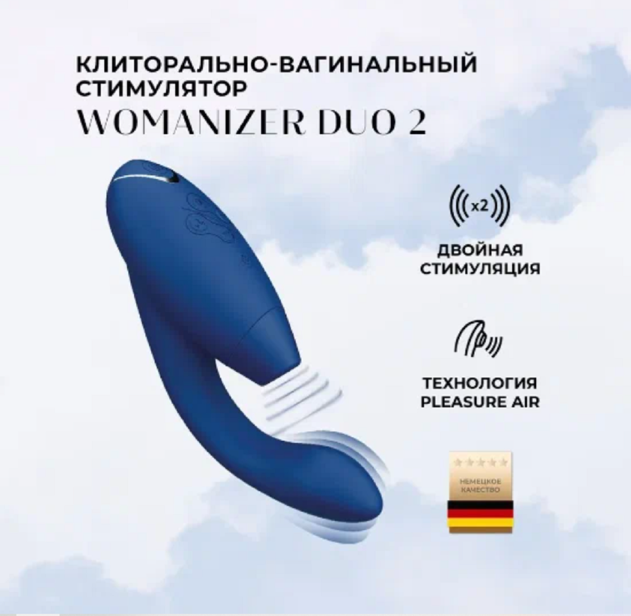 Неважно, являетесь ли вы взыскательной ценительницей удовольствий или просто ищете новых ощущений — бесконтактный клиторальный стимулятор Womanizer Duo поднимет Вас к вершинам оргастических ощущений снова и снова благодаря принципу одновременной стимуляции. DUO имеет клиторальный стимулятор (две стимулирующие головки), выполненный в форме традиционного Womanizer – он мягко ласкает клитор с помощью технологии Pleasure Air, кроме того, у DUO есть мощный вибратор, который адаптируется к форме Вашего тела, чтобы идеально стимулировать Ваши самые важные точки. 12 уровней стимуляции, 10 вариантов вибрации. Мешочек для хранения девайса. Длина 12 см, диаметр 3 см. Цвет синий. Для более комфортного использования рекомендуем приобрести смазку на водной основе и очищающий спрей Clear Toy 100 мл для обработки изделия.