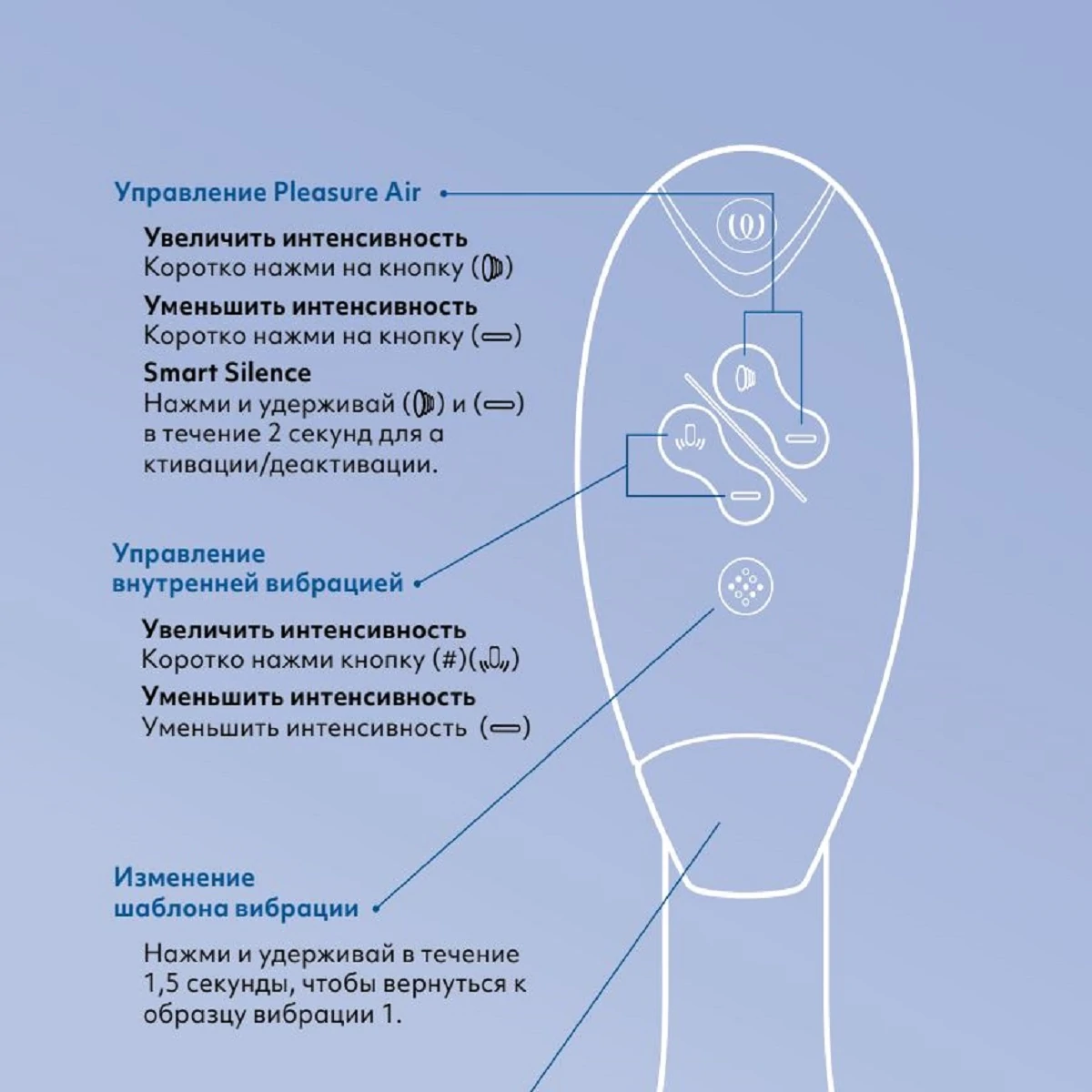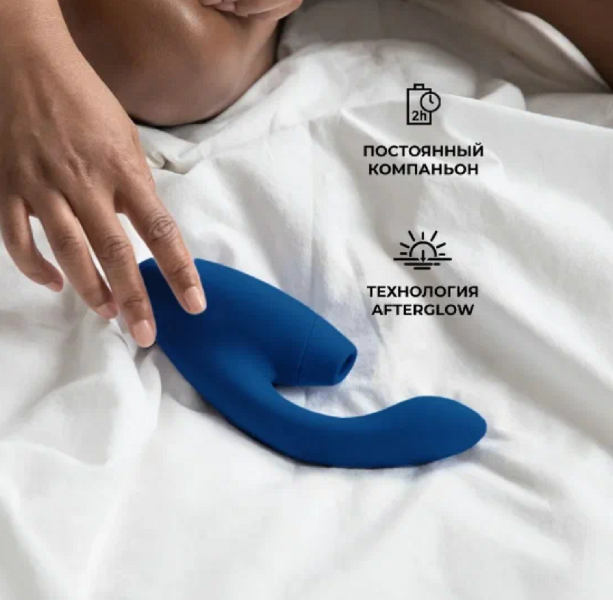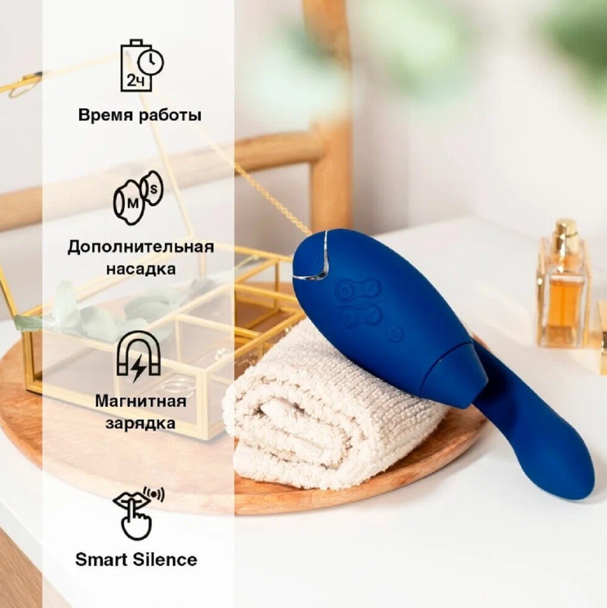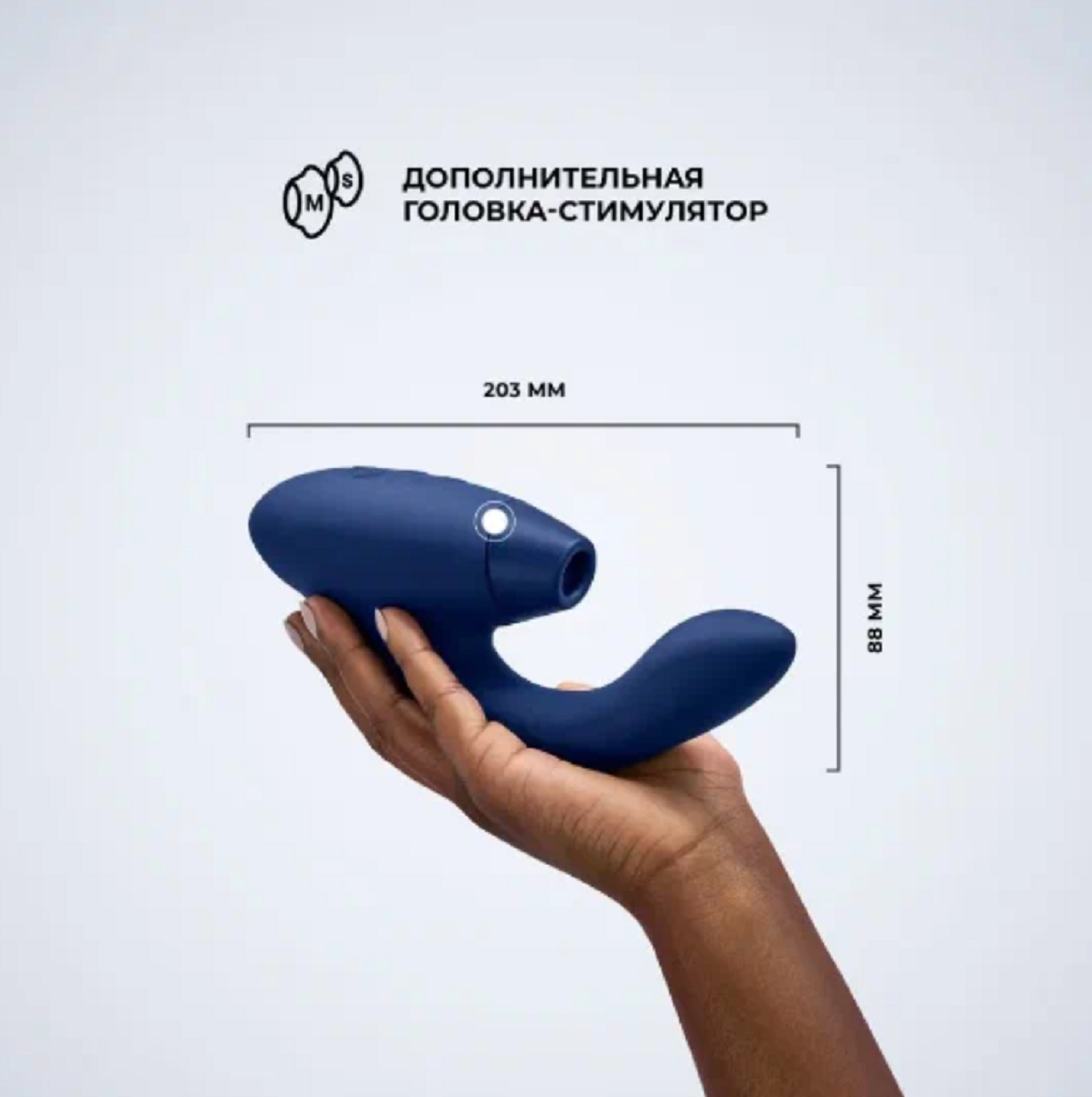 Неважно, являетесь ли вы взыскательной ценительницей удовольствий или просто ищете новых ощущений — бесконтактный клиторальный стимулятор Womanizer Duo поднимет Вас к вершинам оргастических ощущений снова и снова благодаря принципу одновременной стимуляции. DUO имеет клиторальный стимулятор (две стимулирующие головки), выполненный в форме традиционного Womanizer – он мягко ласкает клитор с помощью технологии Pleasure Air, кроме того, у DUO есть мощный вибратор, который адаптируется к форме Вашего тела, чтобы идеально стимулировать Ваши самые важные точки. 12 уровней стимуляции, 10 вариантов вибрации. Мешочек для хранения девайса. Длина 12 см, диаметр 3 см. Цвет синий. Для более комфортного использования рекомендуем приобрести смазку на водной основе и очищающий спрей Clear Toy 100 мл для обработки изделия.