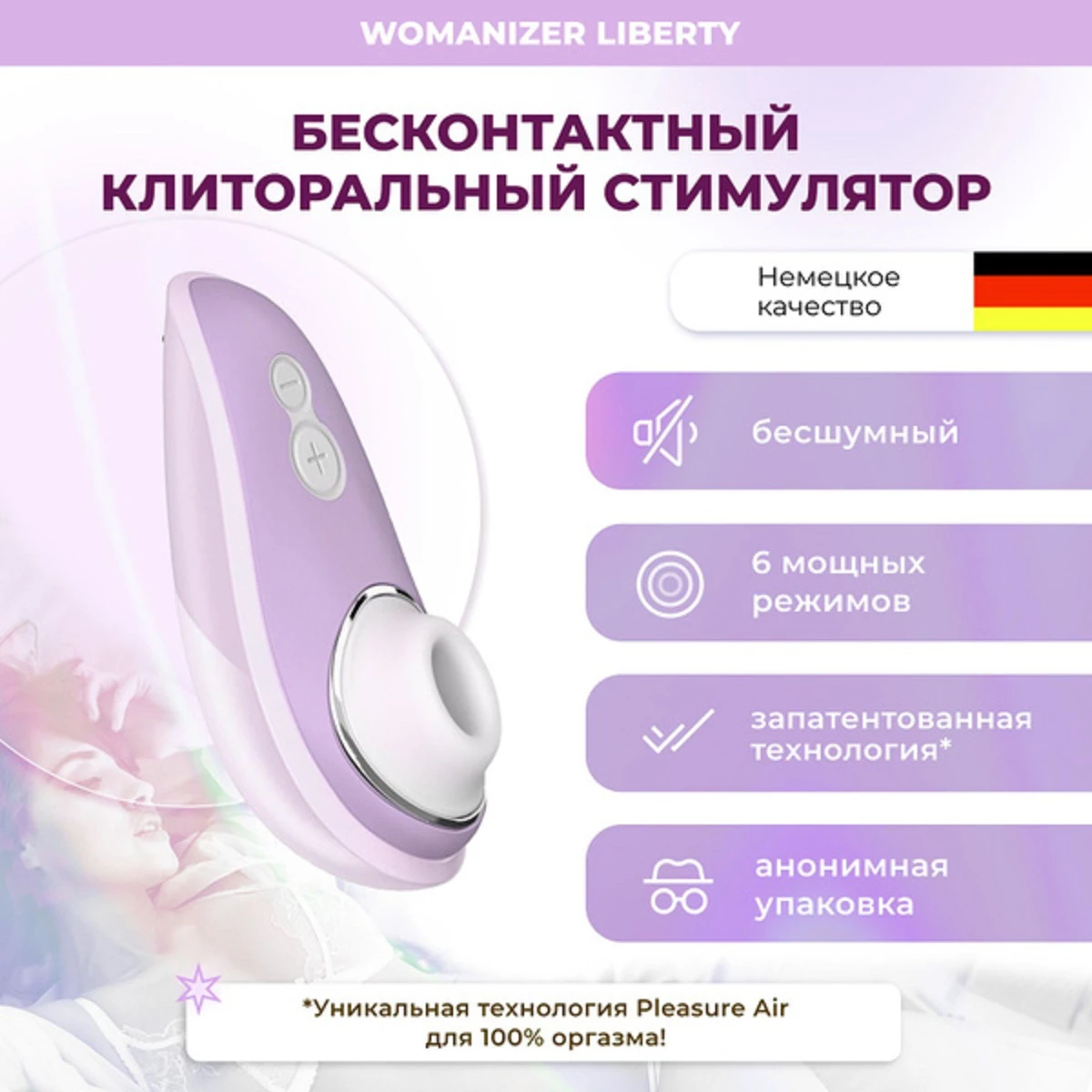 Бесконтактный клиторальный стимулятор Womanizer Liberty использует технологию PLEASURE AIR, которая обеспечивает бесшумную стимуляцию и нежные массирующие воздушные волны. Эта уникальная технология от Womanizer ярко стимулирует клитор потоками воздуха и мягкими волнами без прямого контакта.