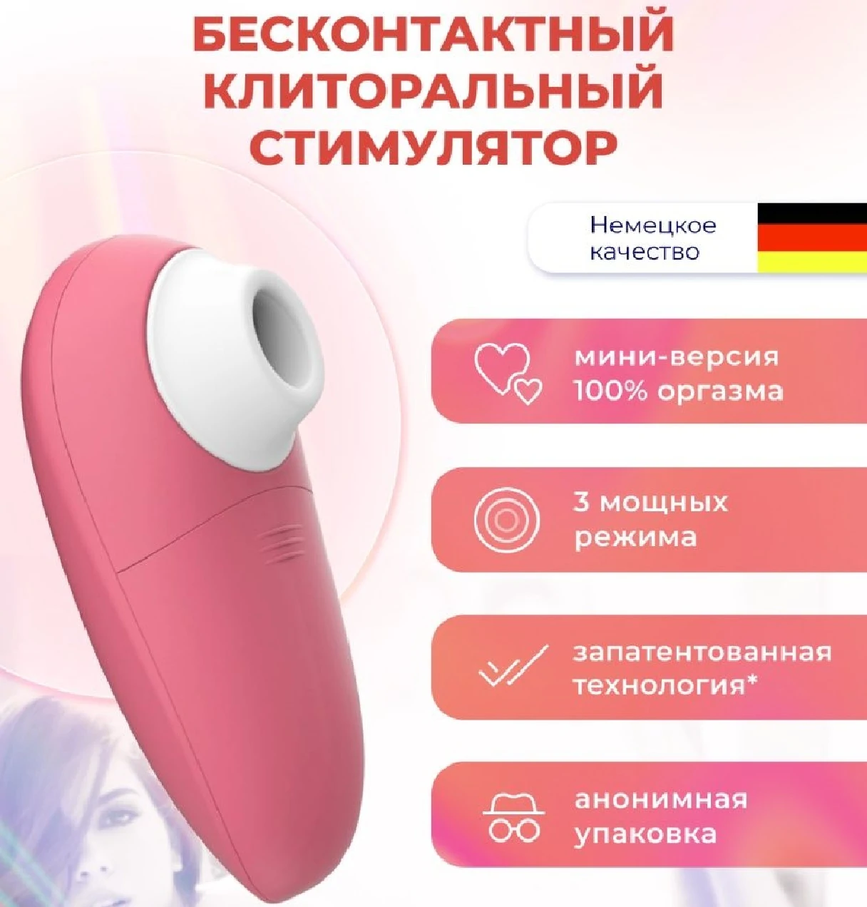 Изумительные оргазмы! Максимум удовольствия в мини-формате. Womanizer Mini идеально подходит для тех, кто мечтает о собственном Womanizer и хочет попробовать, действительно ли он так хорош, как все говорят - И да, он действительно хорош! С Womanizer Mini вы получите полноценный опыт использования Womanizer, хотя и в мини-формате. Сдержанный и практичный: Womanizer Mini - идеальная модель для начинающих для тех, кто хочет открыть для себя и испытать уникальную технологию Pleasure Air. С помощью запатентованной технологии Pleasure Air Womanizer обеспечивает невероятно интенсивную и точную стимуляцию клитора с помощью воздушных волн. Womanizer легко обволакивает и как бы втягивает клитор, а пульсирующие воздушные волны стимулируют его с невероятной точностью. Оргазм приходит снова и снова с Womanizer. Womanizer Mini имеет три уровня интенсивности и питается от батареек типа ААА, которые вы можете легко заменить где бы не оказались. Размер: 11х5х5. Цвет красный.