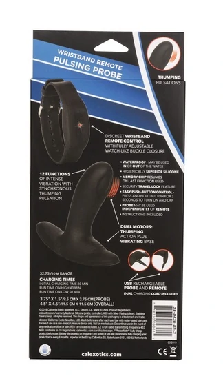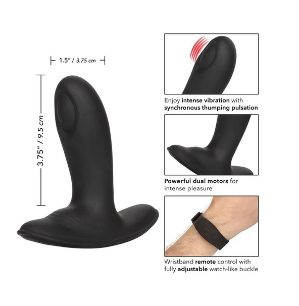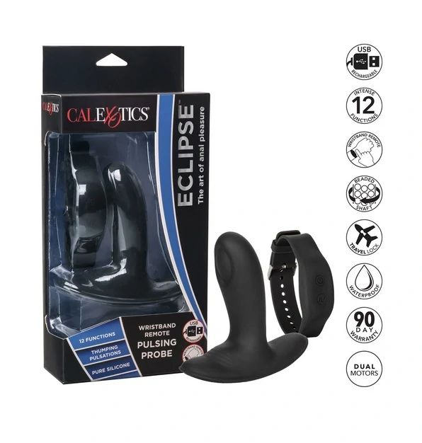Eclipse Pulsing Probe – перезаряжаемое специализированное устройство для массажа простаты на дистанционном управлении с помощью браслета и с вращающейся бусинкой на кончике. Он изготовлен из гладкого литого гигиеничного силикона высшего качества, обеспечивающего удивительно приятные и гарнировано безопасные тактильные ощущения. Два мощных мотора анального стимулятора обеспечивает 12 вариантов равномерной глубокой вибрации и с функцию пульсирующее воздействие! Он имеет изогнутое основание, что не только не дает ему провалиться внутрь, но и позволяет носить ее внутри тела и использовать во время полового акта. Управление осуществляется с помощью браслета. Для активации/дезактивации нажмите кнопку на ограничителе стимулятора и удерживайте 3 секунды, пока не появится красный мигающий огонек. На браслете так же нажимаем кнопку включения и удерживаем до того момента, как появится вибрация в стимуляторе. Радиус управления браслета 9,9 метров. Размер: общая длина 10,5 см, рабочая длина 8,5 см, диаметр 3 см.