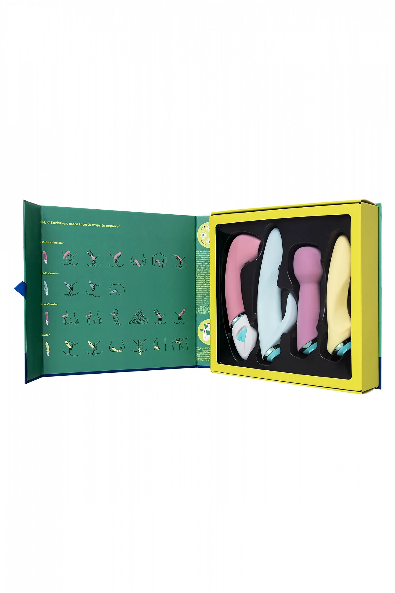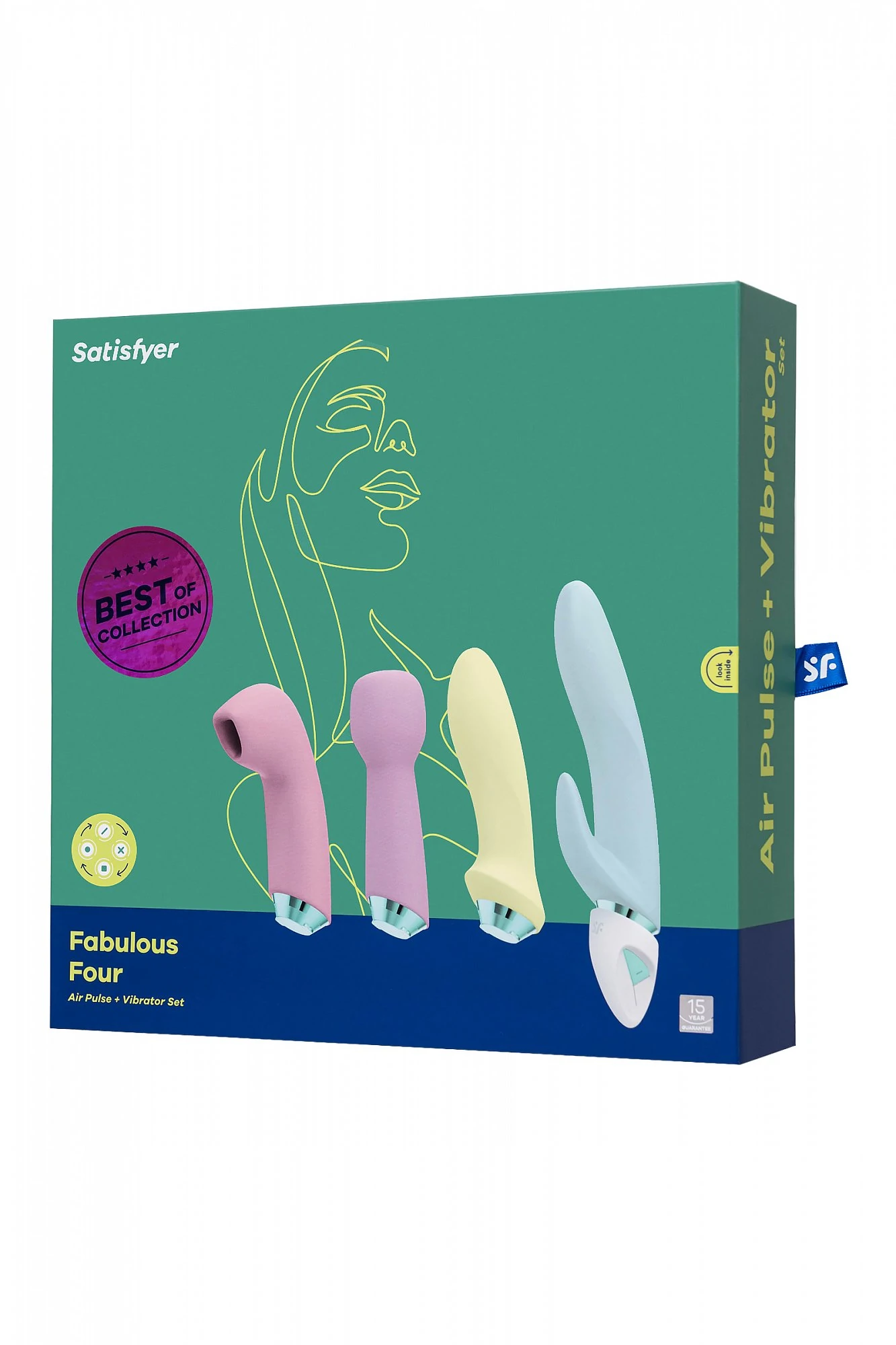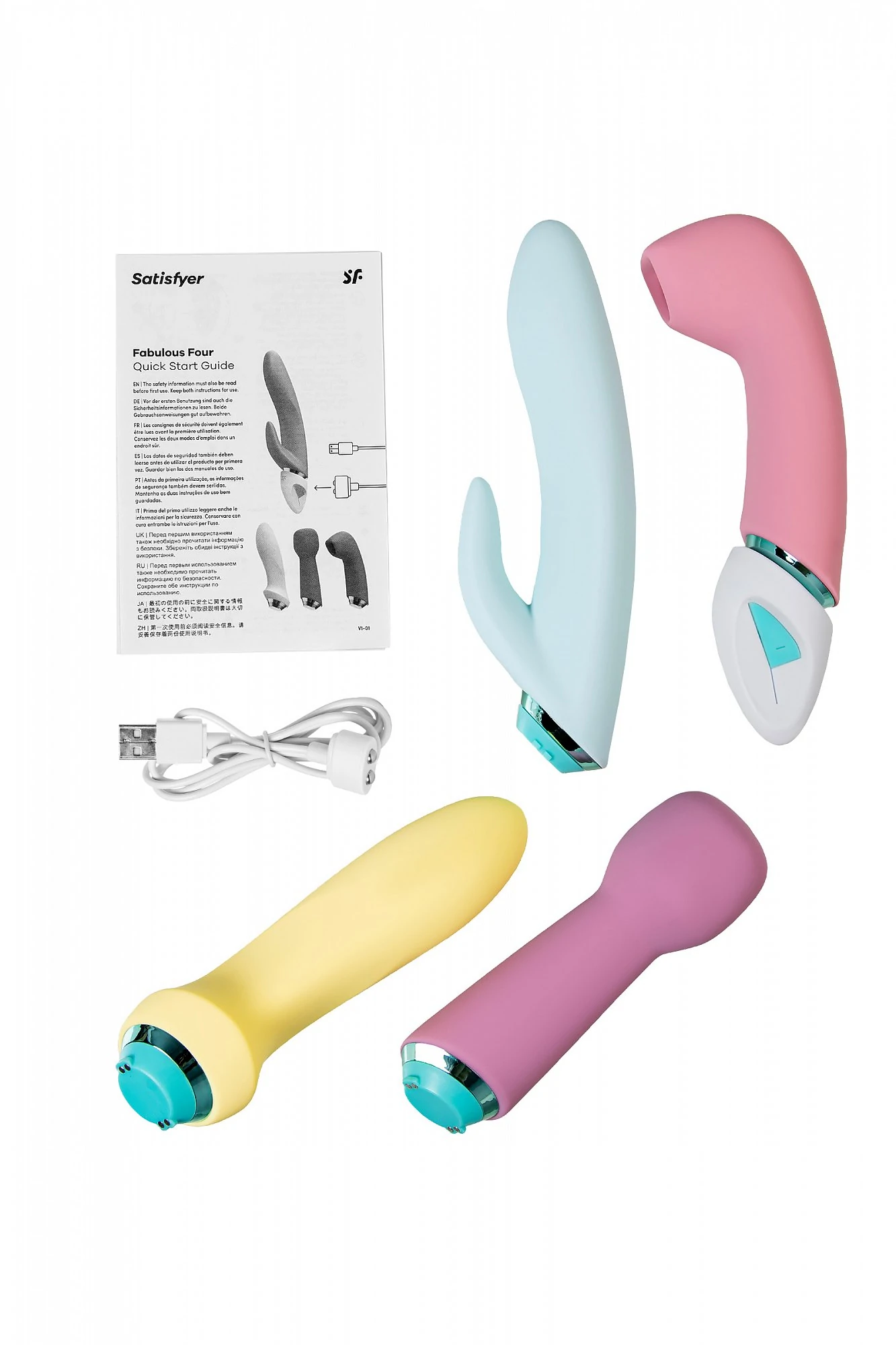 Великолепная четверка Fabulous Four от знаменитого бренда Satisfyer станет персональным проводником в мир удовольствия и наслаждения. С этим набором легко познавать возможности своего тела и партнера. Аккумулятор находится в основании, на котором фиксируются сменные насадки, каждая насадка имеет мощный мотор и 12 режимов вибрации. Вибратор-кролик с погружной длиной 12,5 см и диаметром 3,5 см с двумя моторами позволит ощутить всю прелесть стимуляции зоны G и клитора. Классический вибратор с рабочей длиной 11 см и массажер-ванд длиной 13 см обладают такой же глубокой проникающей вибрацией, способной расслаблять мышцы тела и снимать напряжение. Вакуум-волновой стимулятор имеет расширенный раструб, что позволяет стимулировать не только клиторальную зону, но и область сосков и головки полового члена. Fabulous Four предлагает попробовать вместе с партнером всевозможные виды стимуляции: клиторальную, вагинальную и анальную, а также массаж тела и эрогенных зон.