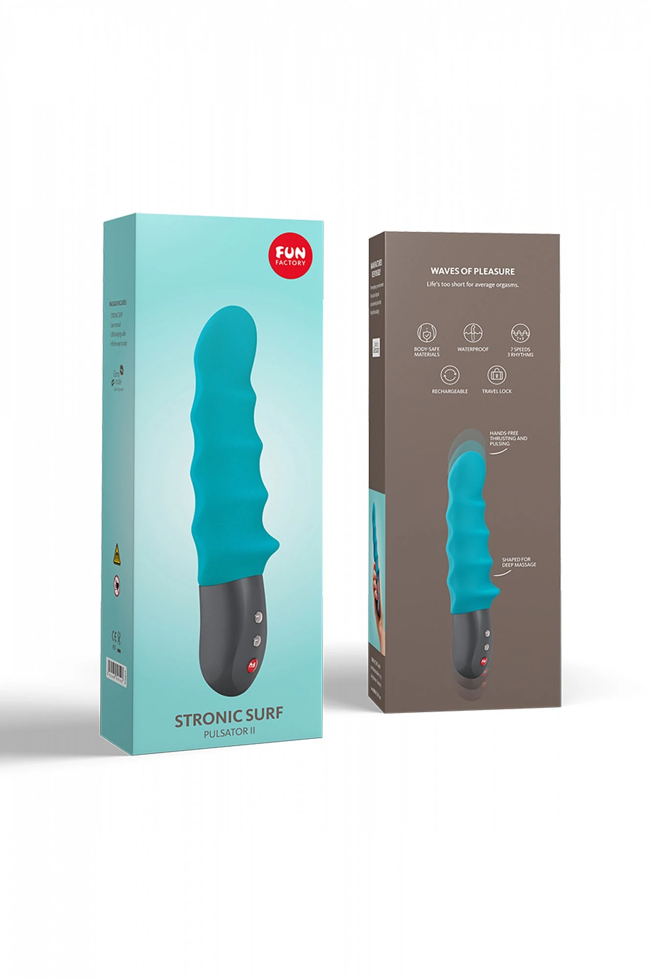 Stronic Surf – самая рельефная игрушка Fun Factory. Он точно понравится тем, кто не любит нежности, а предпочитает более грубую, интенсивную стимуляцию. Изогнутая головка и ребристая поверхность обеспечат максимально чувственную стимуляцию влагалища и точки G. Stronic Surf безопасен и для анальных игр, в данном случае последнее ребро, расположенное у основания ствола игрушки, будет выступать в роли стоппера. На рукоятке девайса расположены 3 объемные кнопочки с подсветкой. Fun включает и выключает устройство, а плюс и минус переключают режимы пульсации. Также Stronic Surf обладает функцией блокировки, 7 режимов и 3 интенсивности стимуляции, светодиодный индикатор процесса зарядки батареи. Размер: общая длина 20,3 см, рабочая длина 12,5 см, диаметр основной части 4,7 см. Цвет: бирюзовый. Для более комфортного использования рекомендуем приобрести смазку на водной основе и очищающий спрей Clear Toy 100 мл для обработки изделия.