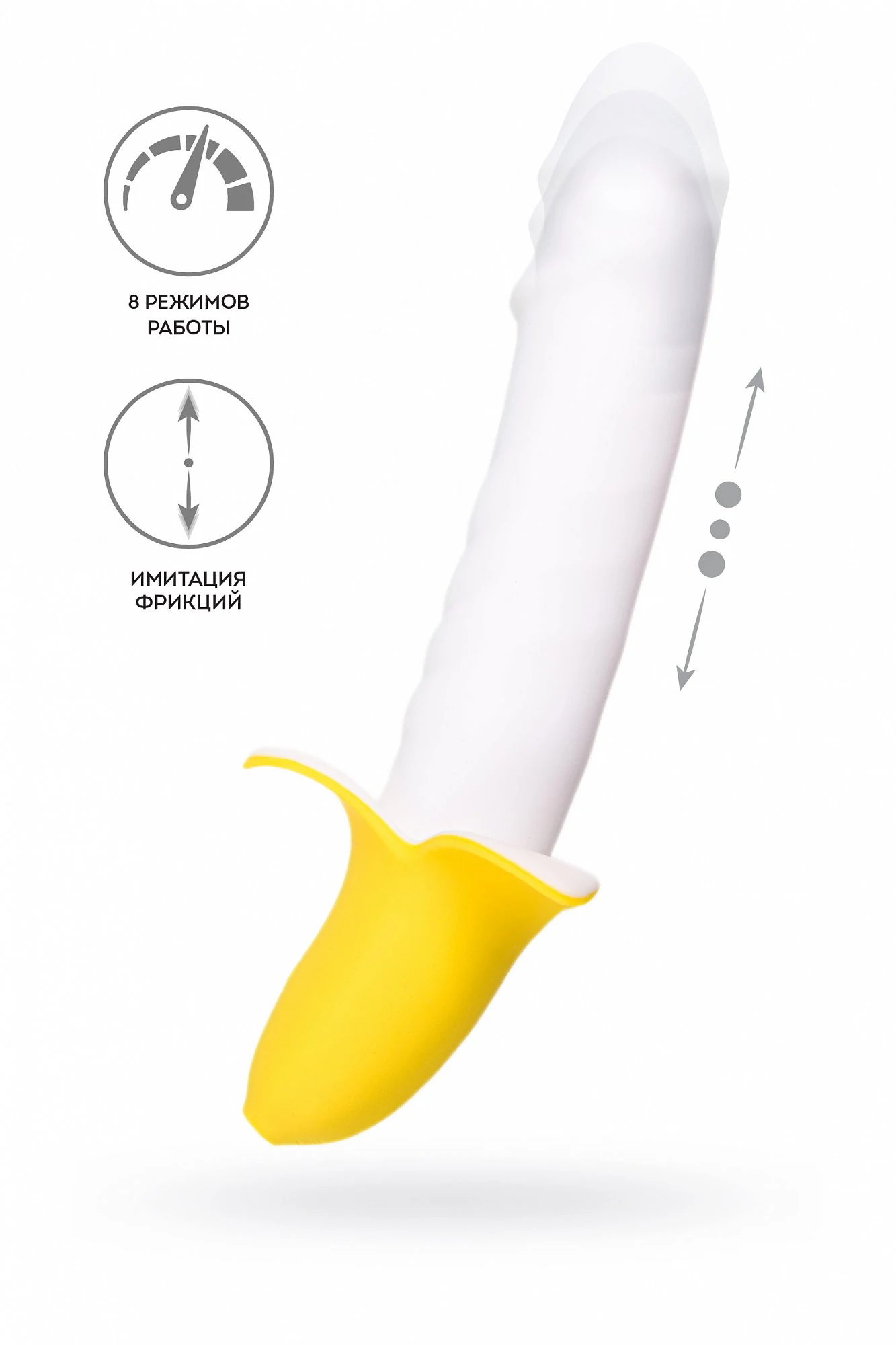 B-nana- массажер с имитацией фрикций. Яркий и вкусный дизайн массажера не оставит никого равнодушным. Имитация головки и ребристая поверхность ствола позволит испытать ощущения на максимуме. Главная фишка - это возвратно-поступательные движения массажера, которые имитируют фрикции. B-nana работает в 8 различных режимах. Мощные оргазмы гарантированы. Комфортное управление одной кнопкой. Изготовлен из высококачественного бархатистого силикона. Размер: общая длина 19 см, диаметр 3,5 см. Цвет белый. Для более комфортного использования рекомендуем приобрести смазку на водной основе и очищающий спрей Clear Toy 100 мл для обработки изделия.