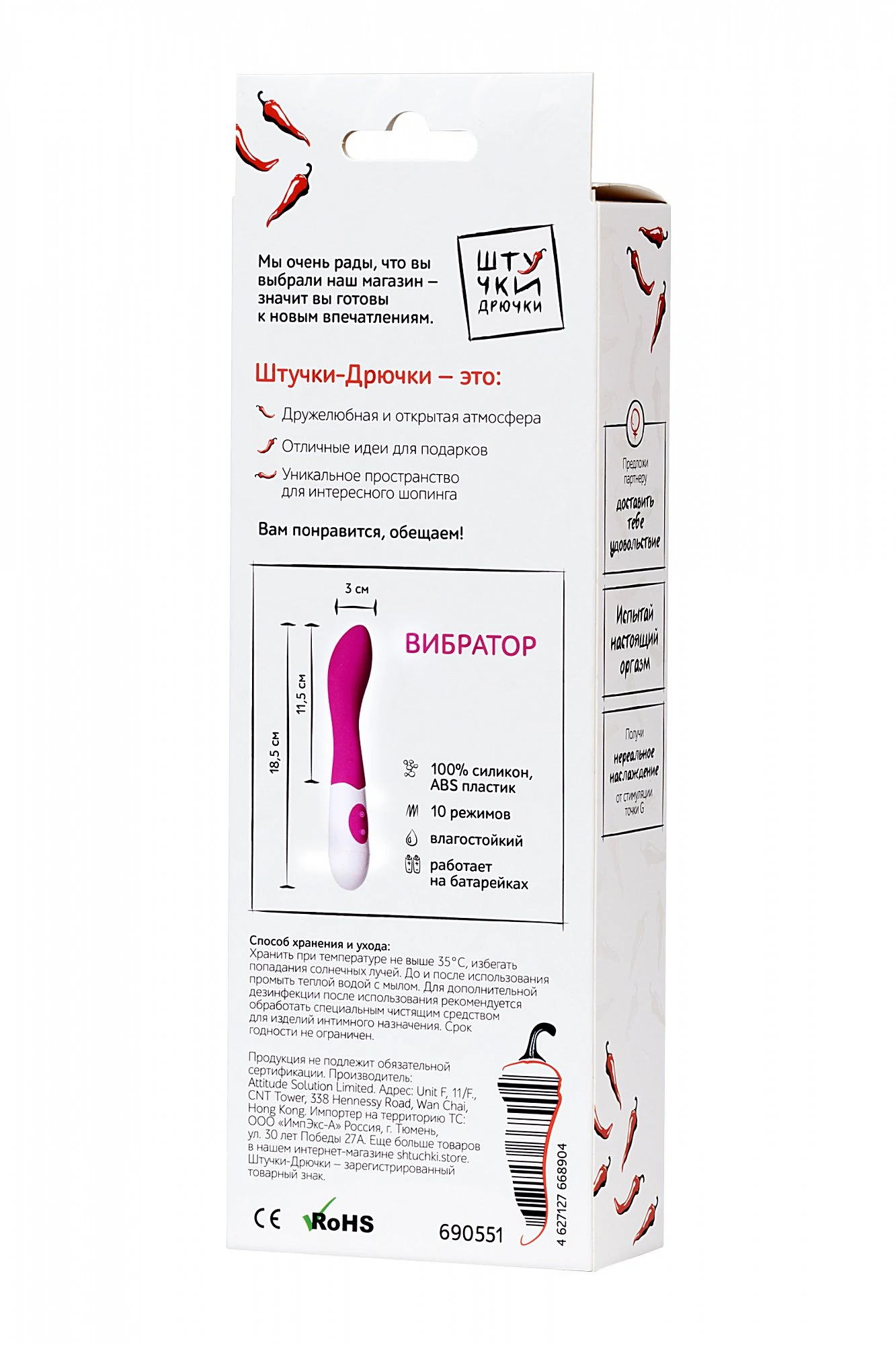 Стимулятор точки G изготовлен из силикона, розового цвета. Имеет 10 режимов вибрации. Размер: длина 18,5 см, рабочая длина 11,5 см, диаметр 3 см.