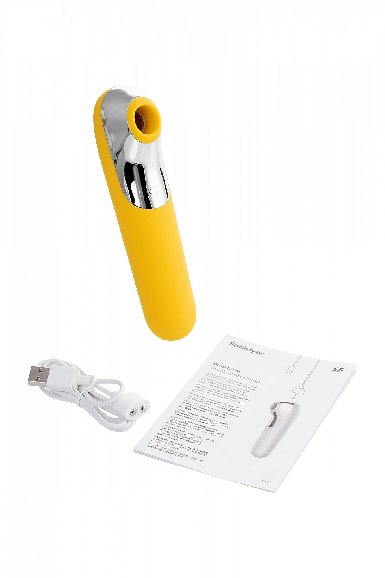 Стимулятор клитора Dual Love стимулирует нервные окончания при помощи волн высокого давления, сочетая их с нежной, чувственной вибрацией. Вы можете выбирать любую из 11 программ стимуляции воздушными волнами и 10 различных настроек вибрации. На боковой поверхности головки находится воронка, фокусирующая воздействие на клиторе. Вы можете перевернуть аксессуар и использовать рукоятку в роли обычного вагинального вибратора. Игрушкой можно управлять при помощи клавиш на корпусе, а также посредством смартфона, где установлено специальное приложение Satisfyer Connect. С его помощью можно значительно расширить возможности девайса, создавая свои собственные, неповторимые режимы стимуляции, позволяет применять аксессуар в ванне и душе. Материал манжеты – медицинский гипоаллергенный силикон. Длина 16 см., ширина 5,5 см. Цвет желтый.