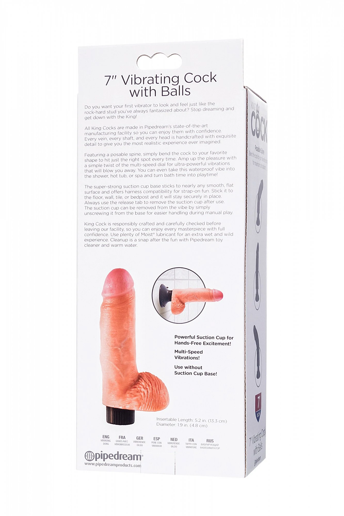 Уникальный вибратор-реалистик King Cock от американского бренда Pipedream как с точки зрения ощущений, так и с позиции визуальных характеристик. Яркий представитель коллекции с реалистичной прорисовкой текстуры ствола, мошонки, и не менее естественным «поведением». Нежный и манящий к прикосновениям, он гарантирует восхитительные ощущения от взаимодействия. Имеет мощную вакуумную присоску, которую можно снять при желании, вибрации при этом будут такие же ощутимые. Благодаря гибкому каркасу, игрушка способна принимать любую подходящую форму. Гибкий внутренний «позвоночник» позволяет экспериментировать с позами – фаллос примет тот угол, который подходит именно вам для максимального удовольствия. Размер: общая длина 21,5 см, рабочая длина 13 см, диаметр 4,1 см. Для более комфортного использования рекомендуем приобрести смазку на водной основе и очищающий спрей Clear Toy 100 мл для обработки изделия.