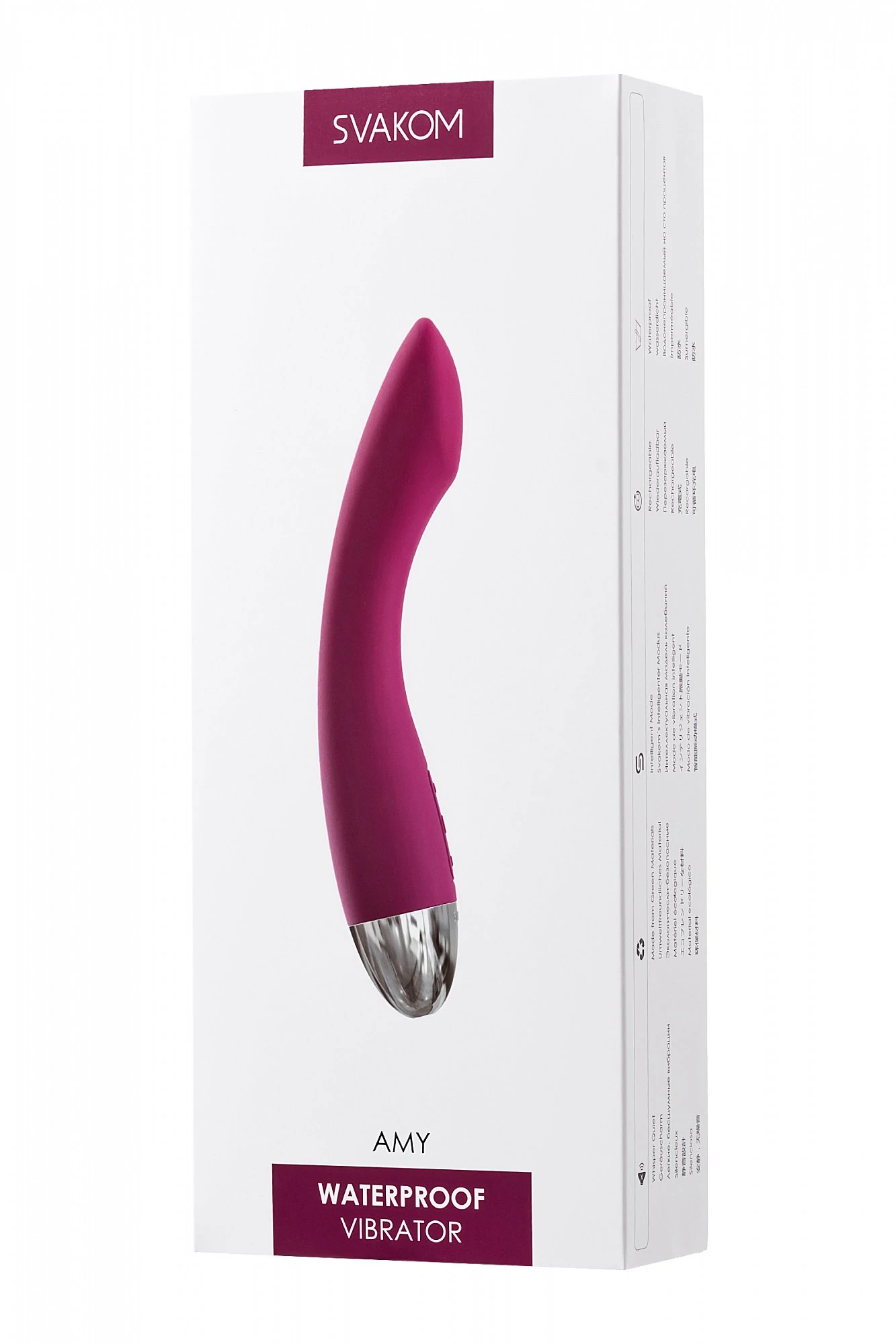 Amy - это водонепроницаемый массажер анатомической формы. Благодаря своей форме он фокусируется на самых чувствительных зонах женского тела. Элегантный, средних размеров вибратор со стимулятором для точки G приятен не только на взгляд, но и на ощупь. Amy не содержит фталатов и абсолютно гипоаллергенна. Конструкция позволяет использовать игрушку в ванной или душе. Amy имеет 6 режимов работы, которыми можно легко управлять с помощью одного прикосновения. Время зарядки - 1,5 часа. Время длительного использования - 3 часа. Общая длина 17 см, диаметр 3 см. Для более комфортного использования рекомендуем приобрести смазку на водной основе и очищающий спрей Clear Toy 100 мл для обработки изделия.