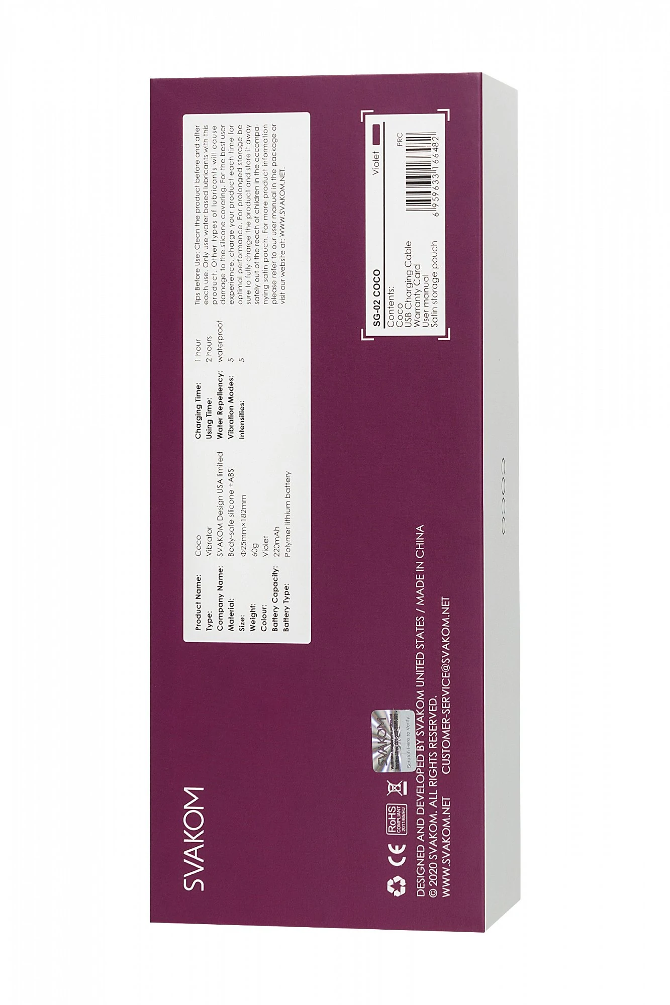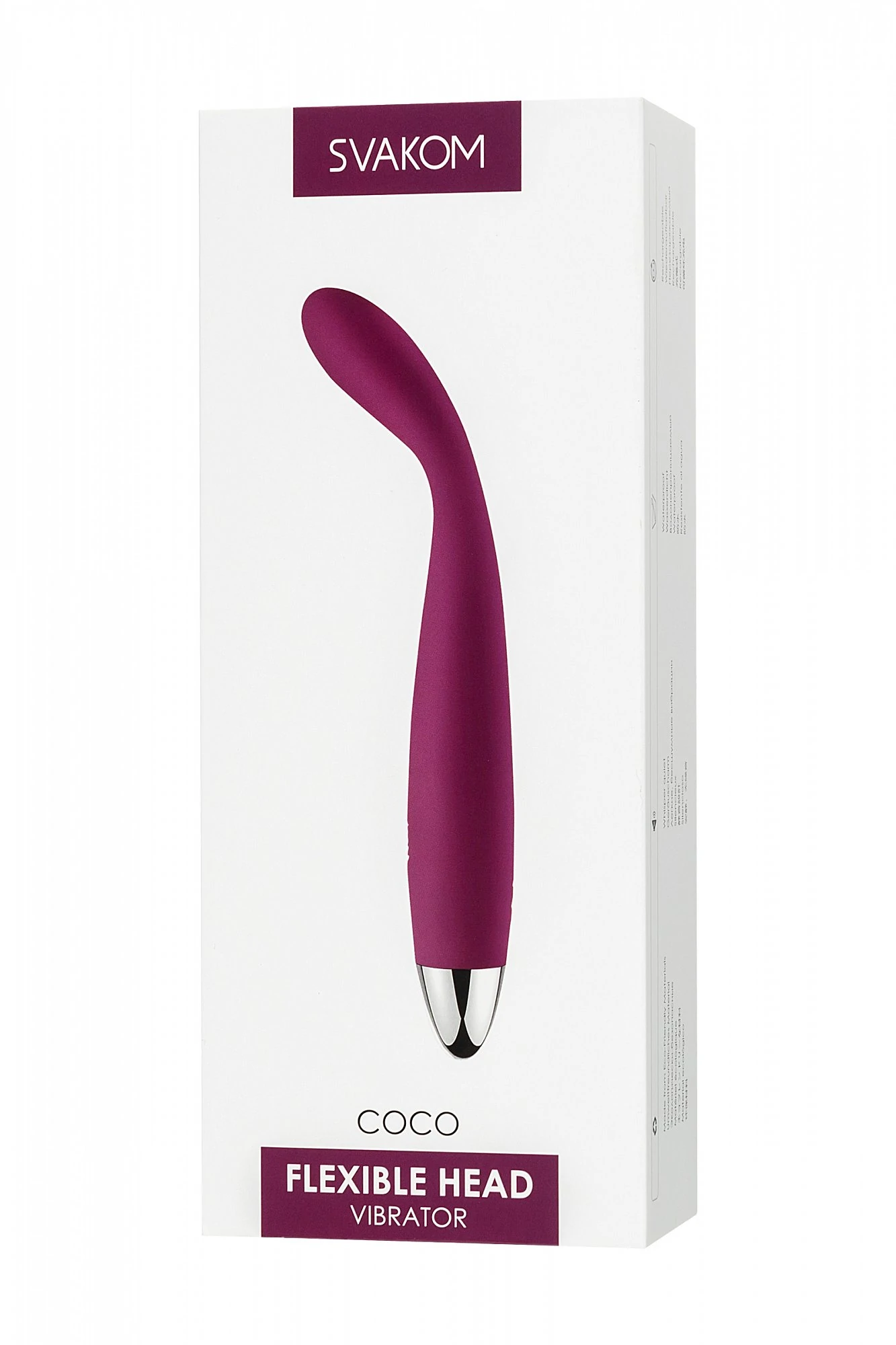 Svakom Coco сочетает в себе уникальные качества, мощный вибромотор для ярких и сочных оргазмов и ультратонкий диаметр ствола вибромассажера. Благодаря этой миниатюрной конструкции вибратор Svakom Coco также может быть введен во влагалище вместе с пенисом. Оба партнера могут чувствовать вибрацию одновременно во время проникновения. Естественная эргономичная форма с изгибом 30 градусов позволяет вибратору Svakom Coco идеально проникать во влагалище и стимулировать зону G. Гибкий вибратор Svakom Coco может изгибаться от 1 до 180 градусов и достанет до самых тайных эрогенных зон. Размер: общая длина 18,2 см, диаметр 2,5 см. Цвет фиолетовый. Для более комфортного использования рекомендуем приобрести смазку на водной основе и очищающий спрей Clear Toy 100 мл для обработки изделия.