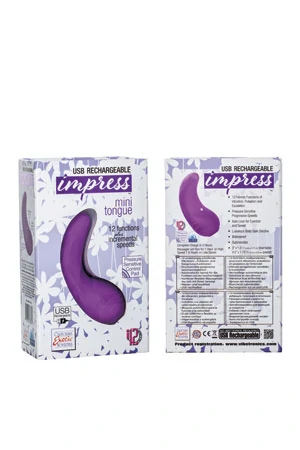 Вибромассажер -мини перезаряжаемый из уникальной коллекции IMPRESS, где управлять можно не только кнопками, но и мягкой подушечкой, которая даёт мощный и плавный вибро-импульс в сердце эрогенной зоны, имитируя выстреливающий мужской оргазм. Управление мягкой и упругой подушечкой дарит партнёру иллюзию прикосновения к нежной женской груди. Эргономичный дизайн позволять использовать IMPRESS USB MINI TONGUE для внутренней и внешней стимуляции чувствительных зон. Проведите исследовательскую экспедицию по телу партнёра или изучите себя самостоятельно. 12 интенсивных функций вибрации, ротации и эскалации для обогащения оргазмических переживаний. Расширь горизонты удовольствия вместе с IMPRESS USB MINI TONGUE!!! Автоматическая блокировка. Прогрессивные скорости чувствительные к давлению. Невероятно интенсивная вибрация по всей площади вибромассажера, время беспрерывной работы на низкой скорости 1,5 часов; на высокой - 1 час. Зарядка USB в комлекте, полный заряд за 2 часа. Бесшумный. 12 интенсивных функций вибрации.