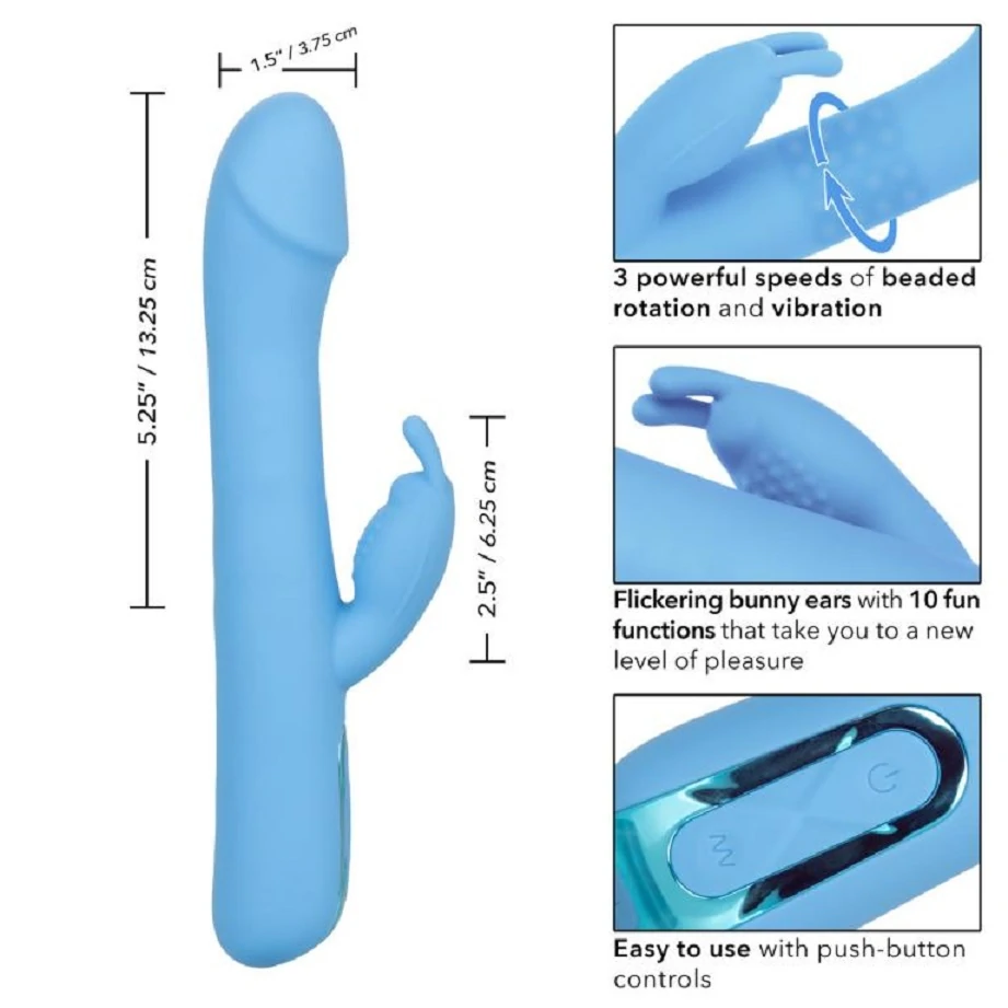 Elite Rotating Rabbit- вибромассажер кролик с увеличенной головкой, для лучшей стимуляции точки G. Вагинальная часть игрушки имеет три скорости ротации, а клиторальная часть 10 режимов интенсивной и глубокой вибрации. Оба мотора могут работать как вместе, так и по отдельности. Управление осуществляется с помощью кнопок, которые расположены на корпусе. Устройство заряжается через USB, просто подсоедините идущий в комплекте шнур к совместимому порту компьютера или USB-адаптера. Размер: общая длина 23,5 см, длина рабочей части 13,25 см, диаметр 3,75 см, длина клиторального отростка 6,25 см, диаметр 2,5 см. Цвет голубой. Для более комфортного использования рекомендуем приобрести смазку на водной основе и очищающий спрей Clear Toy 100 мл для обработки изделия.