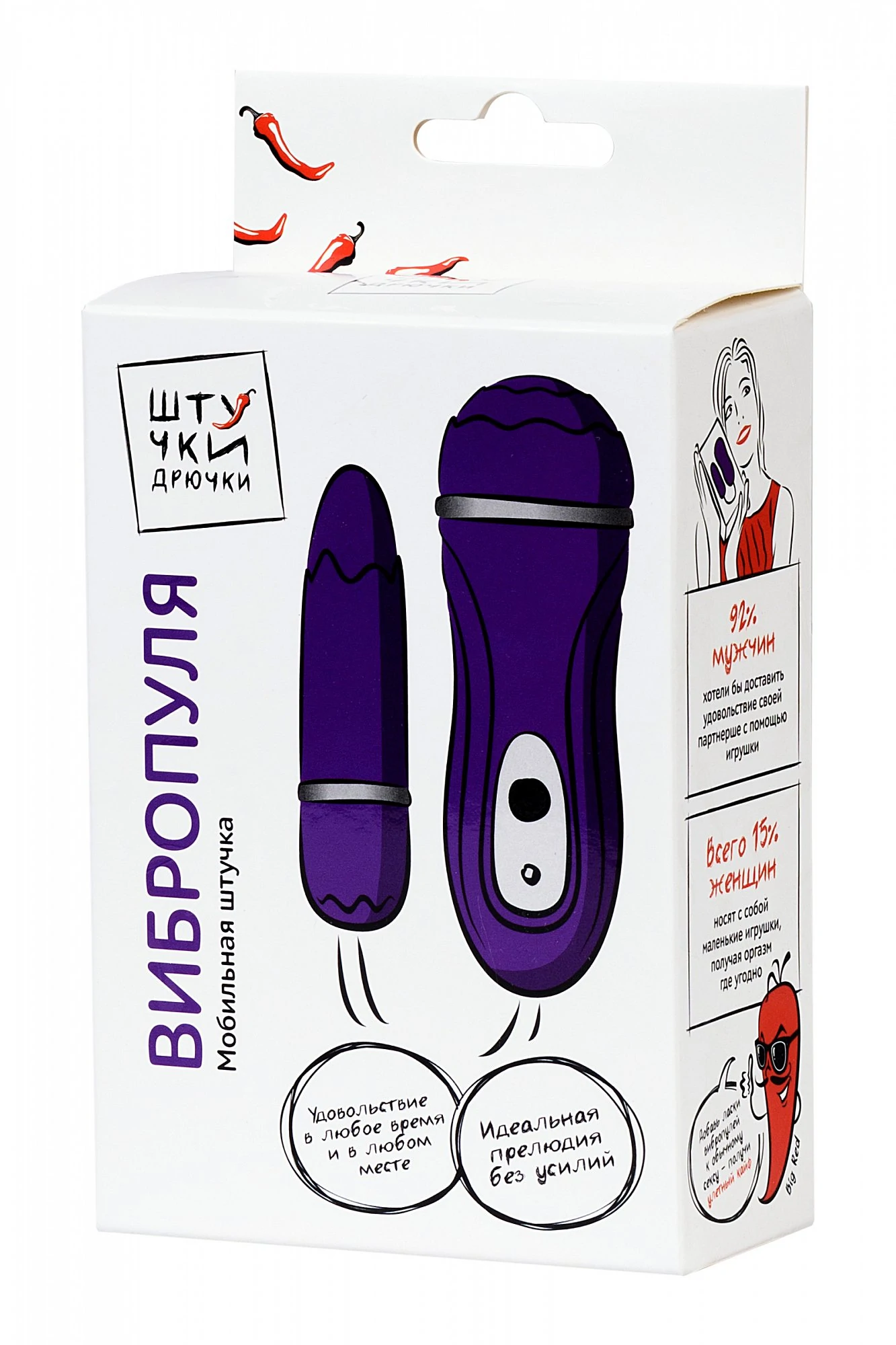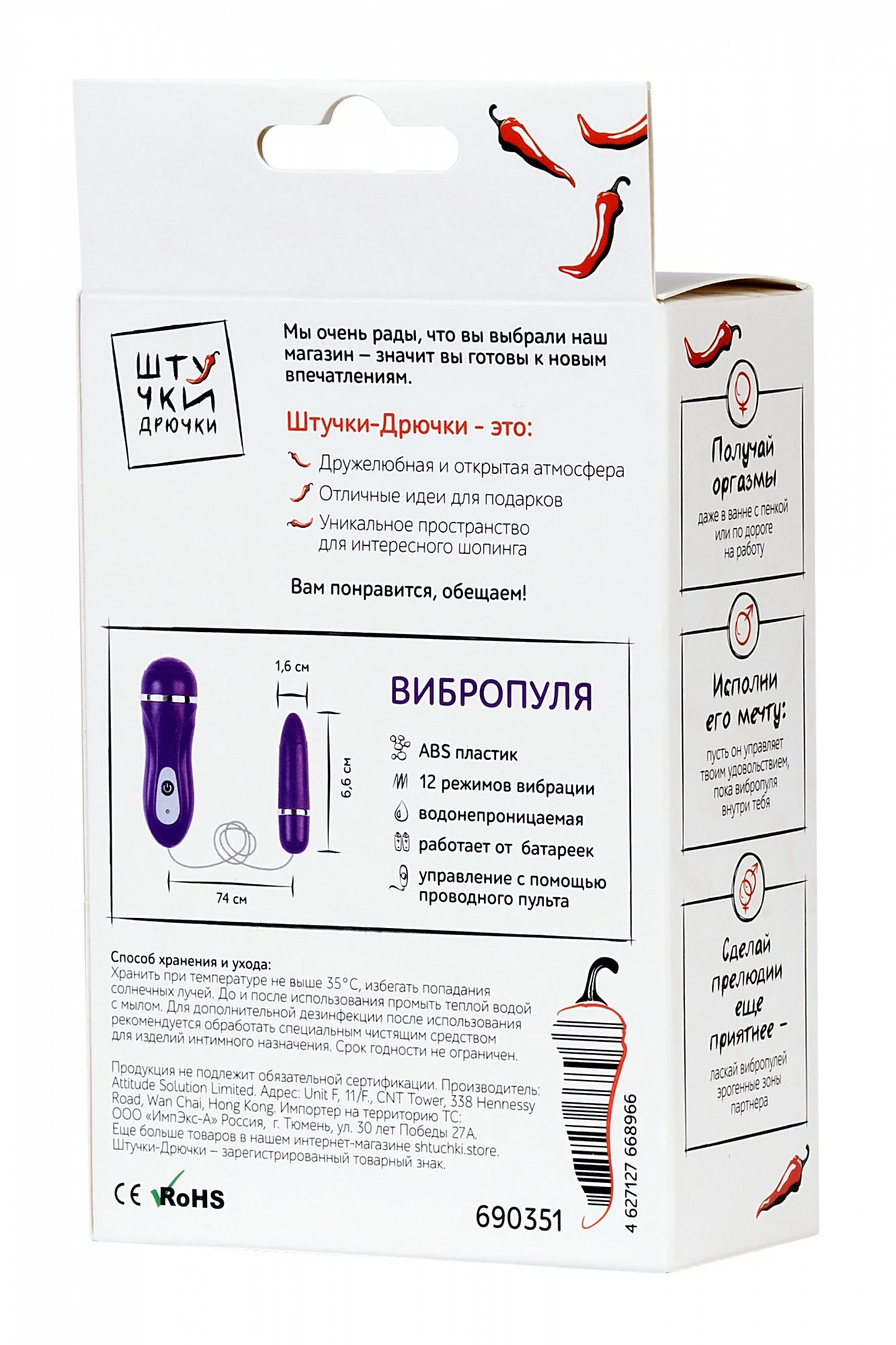 Вибропуля изготовлена из ABS пластика, фиолетового цвета. Имеет 12 режимов вибрации. Размер: длина 6,6 см, диаметр 1,5 см.