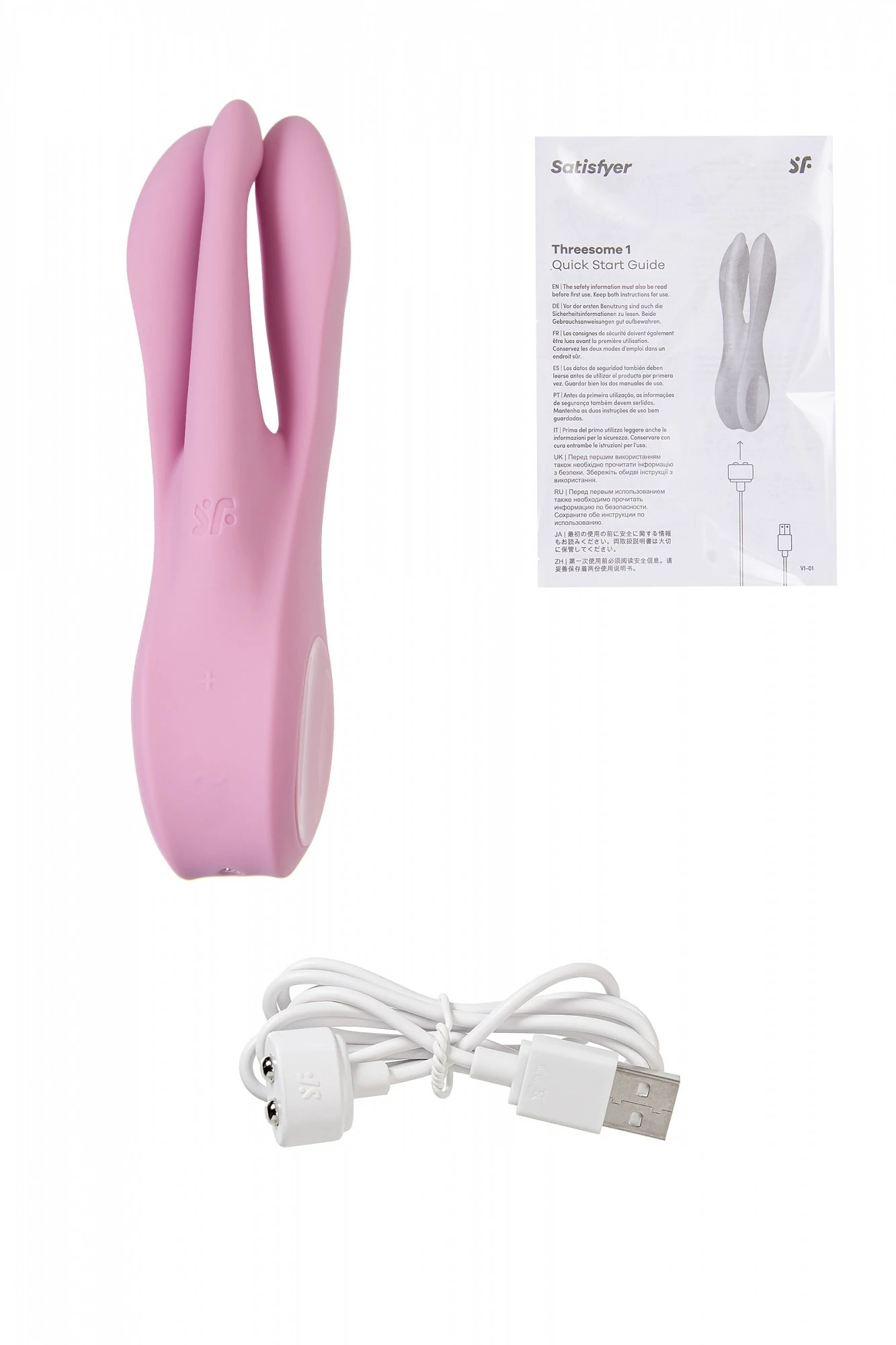 Необычный вибратор Threesome от Satisfyer способен подарить особое удовольствие благодаря уникальной форме. Форма ствола вибратора имеет три гибких отростка-пальчика. Threesome – это многофункциональный вибратор для стимуляции активных эрогенных зон. С ним вы легко осуществите самые смелые фантазии, даже о “тройничке”. Вибратор отлично дополнит парные развлечения и соло-игру. 3 гибких вибрирующих отростка отлично стимулируют клитор, вульву, пенис, соски и любые другие эрогенные зоны. 3 мощных мотора пробуждают волны наслаждения, передавая вибрационные ритмы по всей игрушке, стимулируя самые чувствительные области вашего тела и улучшая сексуальное здоровье. Два боковых отростка более объемные, третий отросток в центре – поменьше, имеет отдельное управление вибрацией. Игрушка имеет по 12 паттернов вибрации на боковых и среднем отростках, управляется легко и интуитивно кнопками на передней панели. Для более комфортного использования рекомендуем приобрести смазку на водной основе и очищающий спрей Clear Toy 100