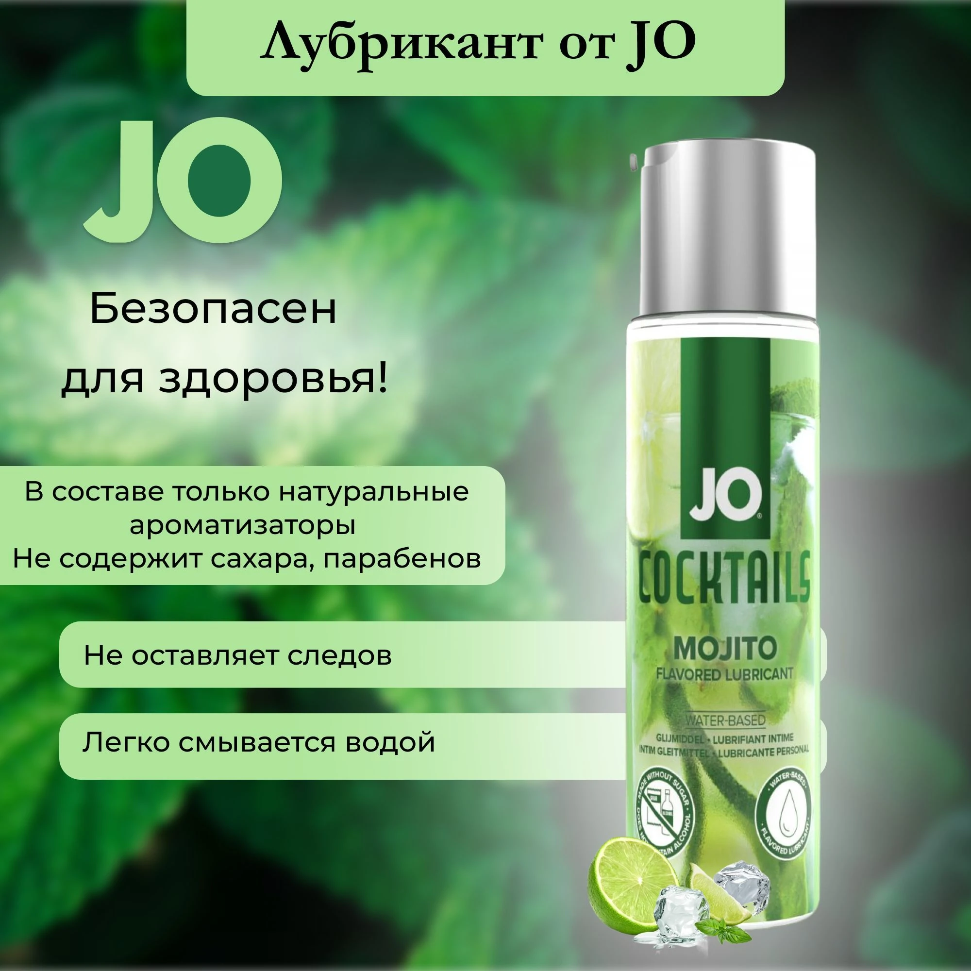 самых популярных коктейлей - Мохито. Глицерин растительного происхождения в составе. Не содержит сахара, подсластителей и алкоголя. Безопасен для проглатывания и вагинального использования. Не нарушает микрофлору и кислотно-щелочной баланс влагалища. Лубрикант имеет водную основу, но она такая же нежная как силикон, обеспечивает долгое скольжение, никакой липкости, легко смывается водой. Лубрикант совместим с материалами большинства игрушек. JO рекомендуется во всем мире врачами и фармацевтами. Обладает всеми преимуществами фаворита JO H2O, плюс приятный аромат и нежная сладость. Идеален для оральных игр. Совместим с алкоголем. Можно добавлять в напитки, использовать как топинг, смешивать коктейли из разных вкусов. Состав: Вода, глицерин, сорбат калия, гидроксиэтилцеллюлоза, натуральный пищевой ароматизатор, хлорид натрия, лимонная кислота, сукралоза. Объем: 60 мл.