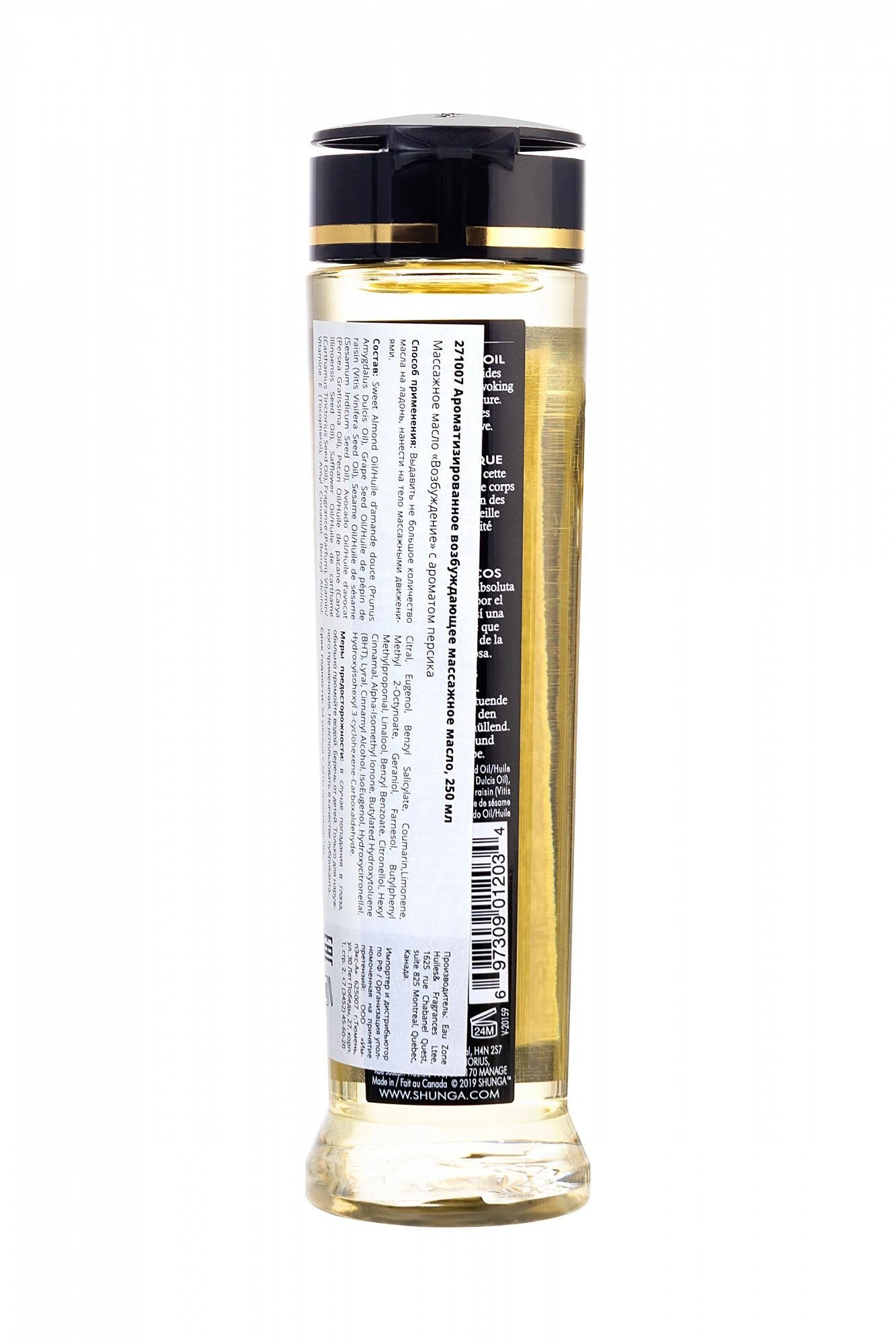 Натуральное массажное масло с упоительными ароматами идеально подходит для взаимного расслабляющего массажа, совмещённого с чувственными ласками. Масло легко скользит по коже, не оставляя жирной пленки. В отличие от большей части средств SHUNGA, ароматизированных вкусовыми ароматами, запах массажному маслу придают эфирные масла и ароматы, что делает его несъедобным. Изготовлено из натуральных масел холодного отжима. Не оставляет жирных пятен. Содержит Витамин Е (антиоксидант). Не закупоривает поры кожи. Не содержит минеральных или животных масел. Применение: налейте небольшое количество на ладонь и разогрейте масло в ладонях, чтобы оно приобрело температуру тела. При желании вы можете нагреть масло в горячей воде для более горячего массажа. Для полного массажа тела. Избегать контакта с интимными зонами. Обратите внимание на то, что данное массажное масло ароматизировано эфирными маслами и отдушками, а, следовательно, не съедобно. Не рекомендуется в качестве персонального лубриканта. Объем: 240мл.