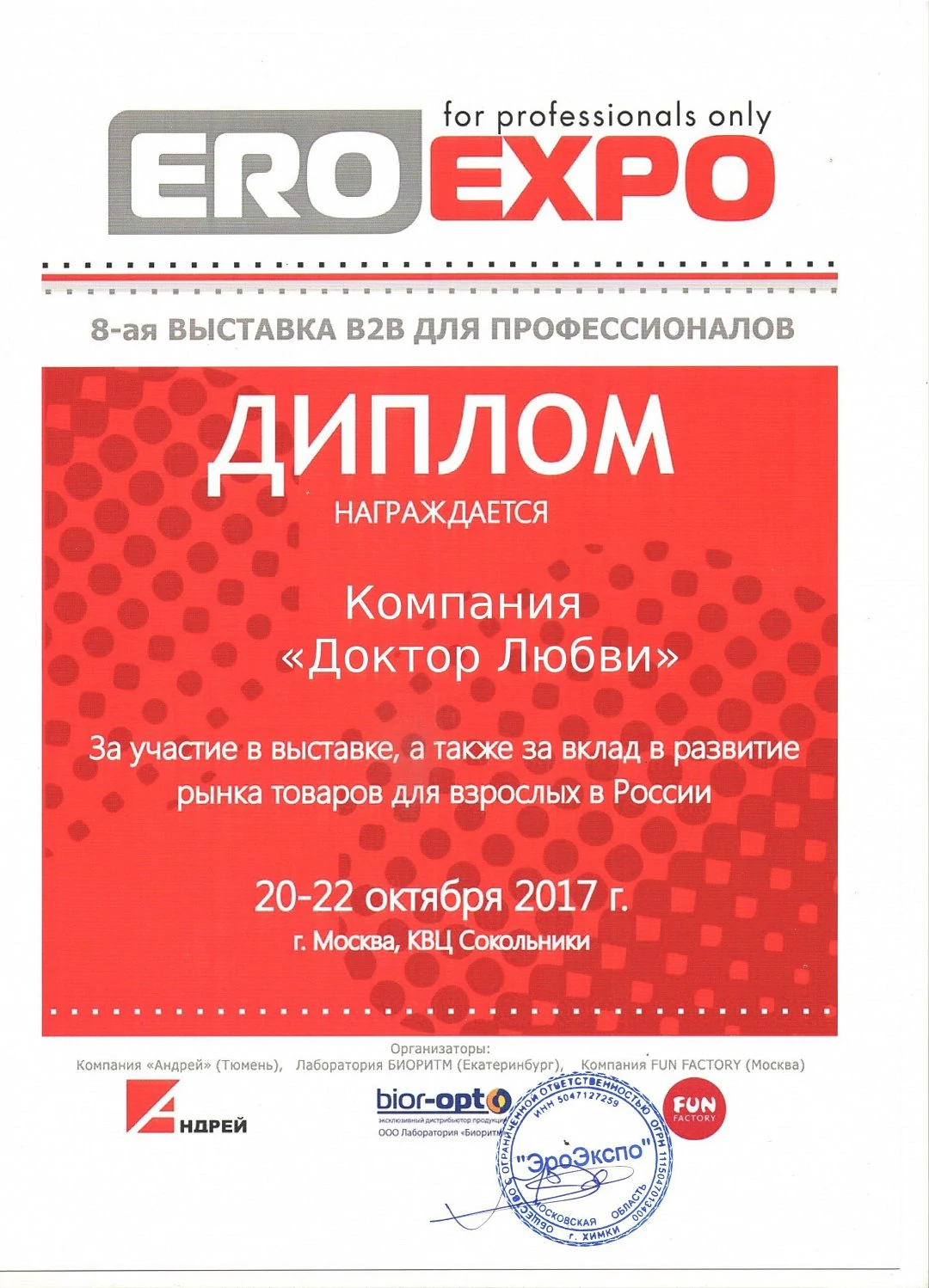 Диплом «EROEXPO2017» за вклад в развитие Adult индустрии в РФ