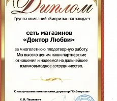 Диплом БИОРИТМ за многолетнюю плодотворную работу