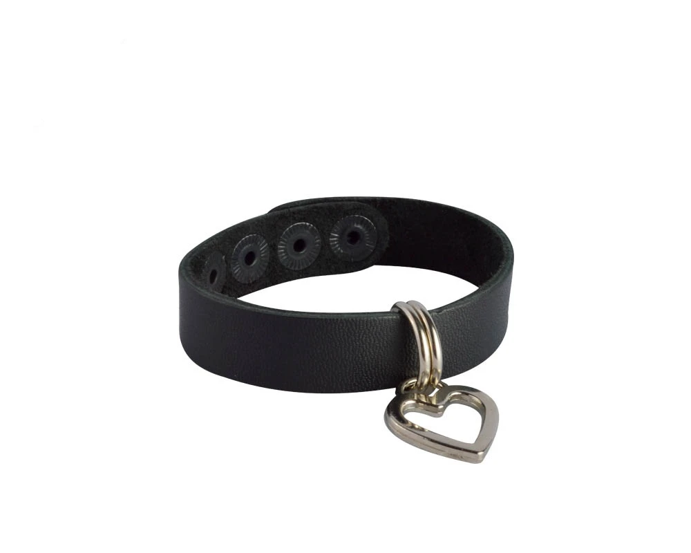 Браслет из натуральной кожи черного цвета украшен подвесным металлическим сердечком. Регулируется при помощи кнопок. Размеры: длина браслета 21 см, ширина 1,5 см. Металлическое сердце имеет никелевое покрытие.