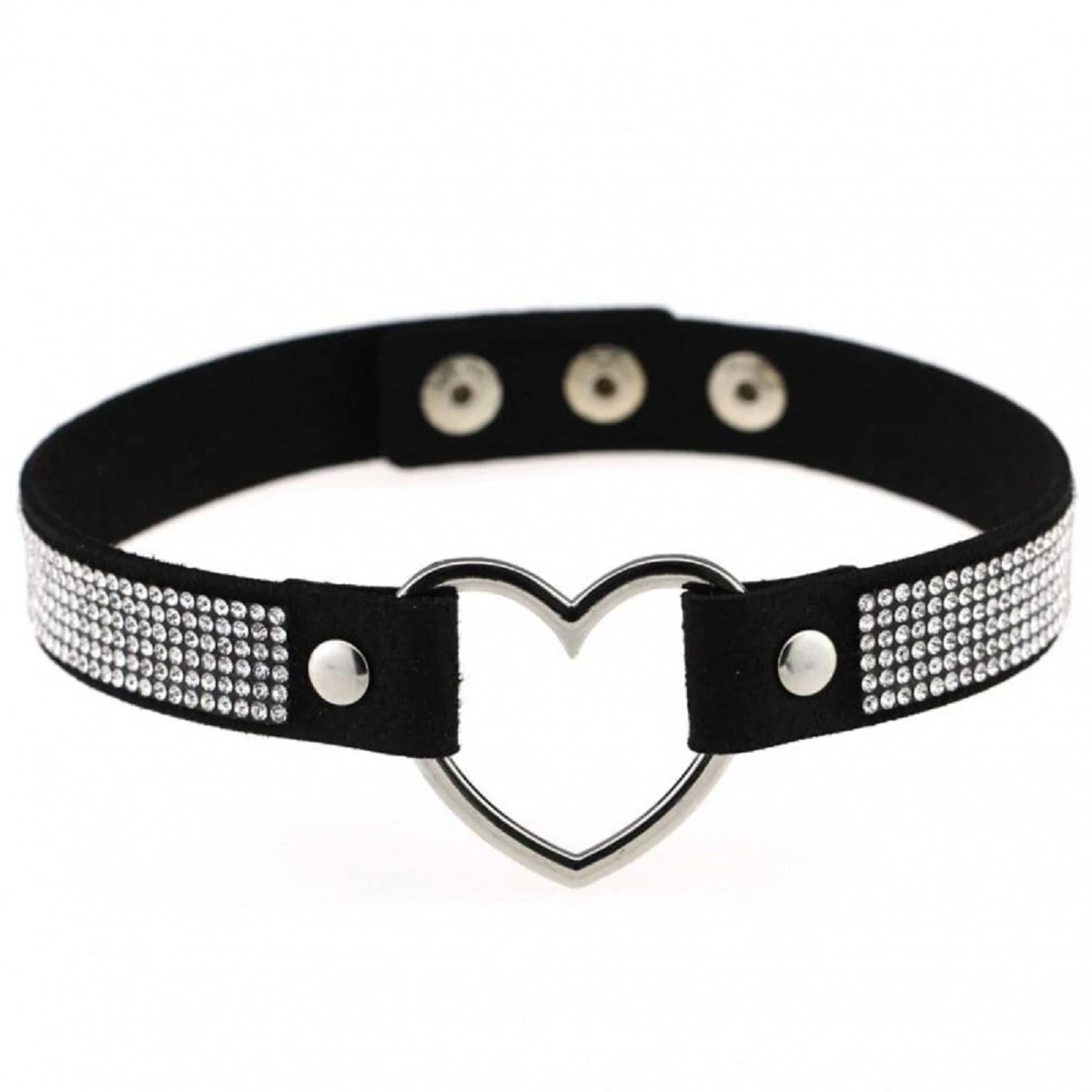 Стильный чокер из черной экокожи с металлическим сердцем и стразами. Размер: длина чокера 39 см, ширина - 1,8 см. Регулируется при помощи кнопок застежек.