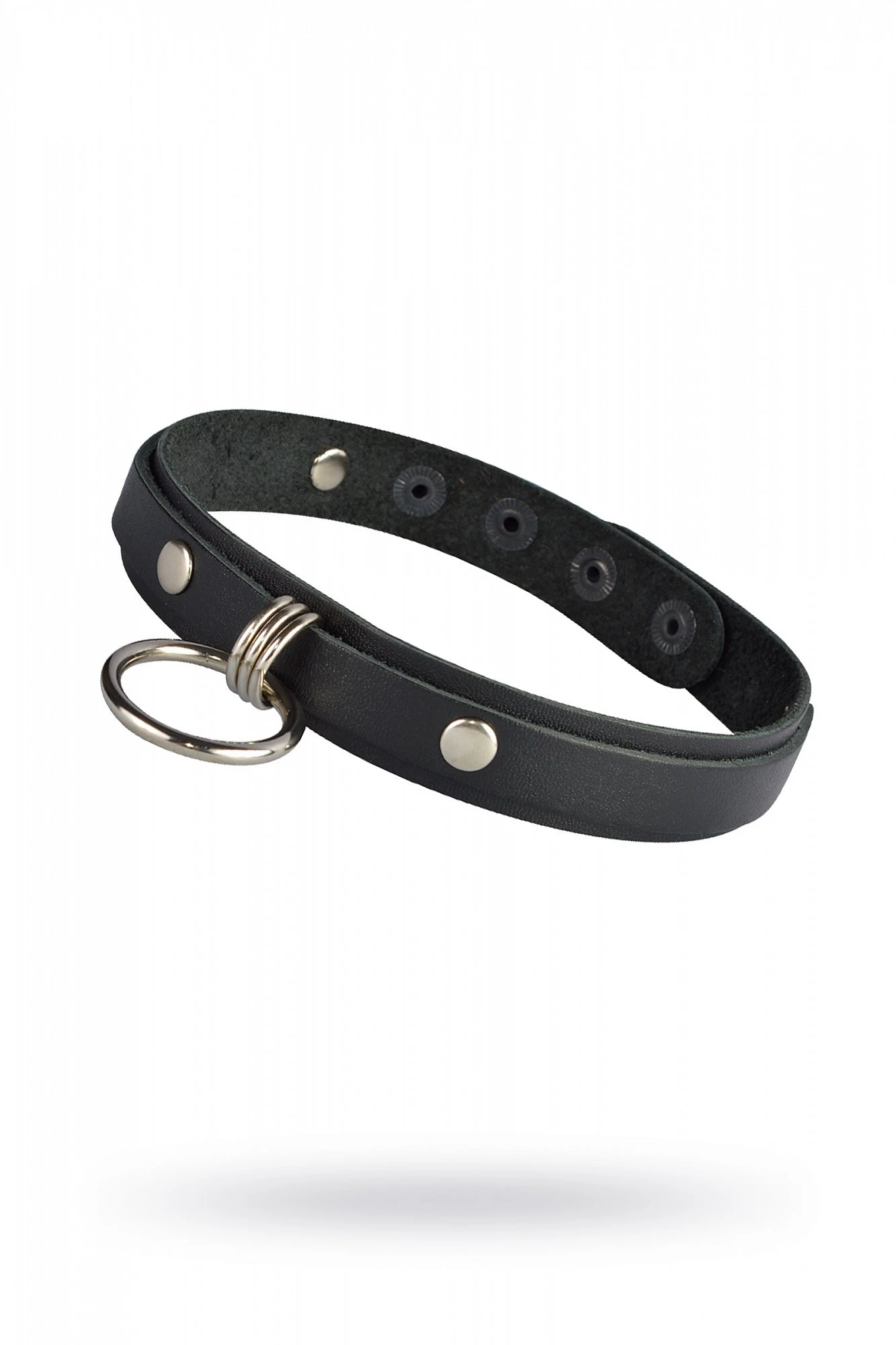 Стильный чокер изготовлен из натуральной кожи черного цвета и декорирован металлическим кольцом диаметром 3,3 см. Длина чокера 41 см, ширина - 2 см. Вся металлическая фурнитура имеет никелевое покрытие. Регулируется при помощи кнопок. Размер: универсальный. Цвет: черный.