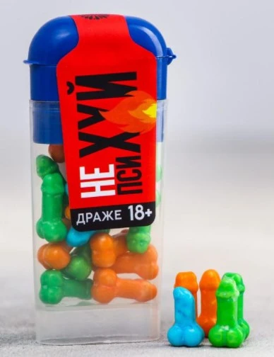 Драже в пластиковой баночке "Не психуй. 18+". Состав: глюкоза 76,21 %, сахар 15 %, сироп глюкозы 5 %, мальтодекстрин 3 %, лимонная кислота 0,5 %, стеарат магния 0,25 %, искусственный ароматизатор 0,02 %, искусственный краситель 0,01 %, Е129, Е102, Е133, Е171.