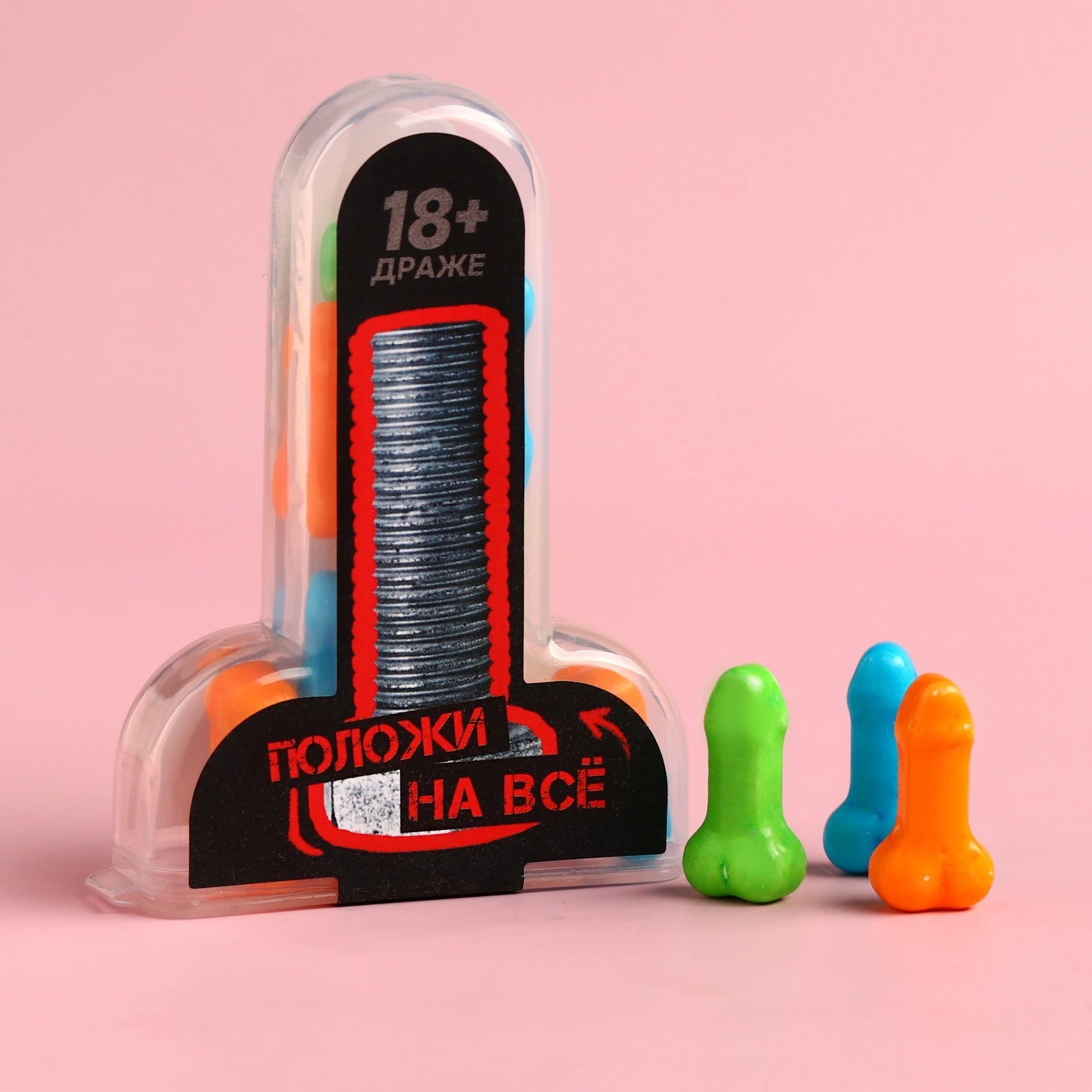 Драже в пластиковой баночке Положи на все 18+. Состав: глюкоза 76,21 %, сахар 15 %, сироп глюкозы 5 %, мальтодекстрин 3 %, лимонная кислота 0,5 %, стеарат магния 0,25 %, искусственный ароматизатор 0,02 %, искусственный краситель 0,01 %, Е129, Е102, Е133, Е171.