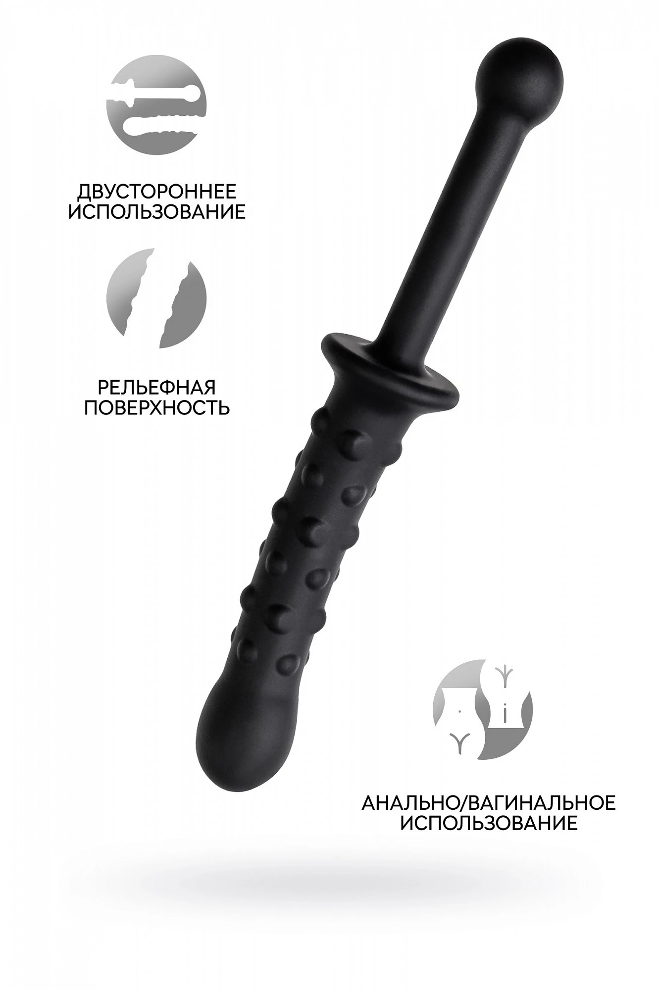 Это секс-игрушка для анальных игр и наслаждений. Приятный мягкий материал, выпуклый рисунок для дополнительной стимуляции с одной стороны, гладкая поверхность с утолщением с другой - все для создания идеального давления на стенки ануса или вагины и получения незабываемого удовольствия. Размер: общая длина 24,5 см, рабочая длина 13 см, диаметр 2,3-3,2 см.