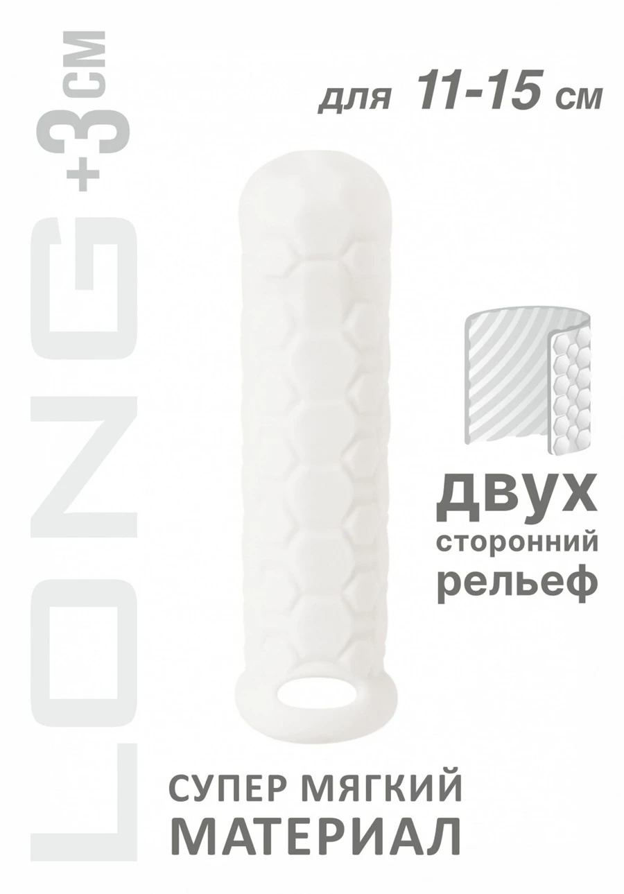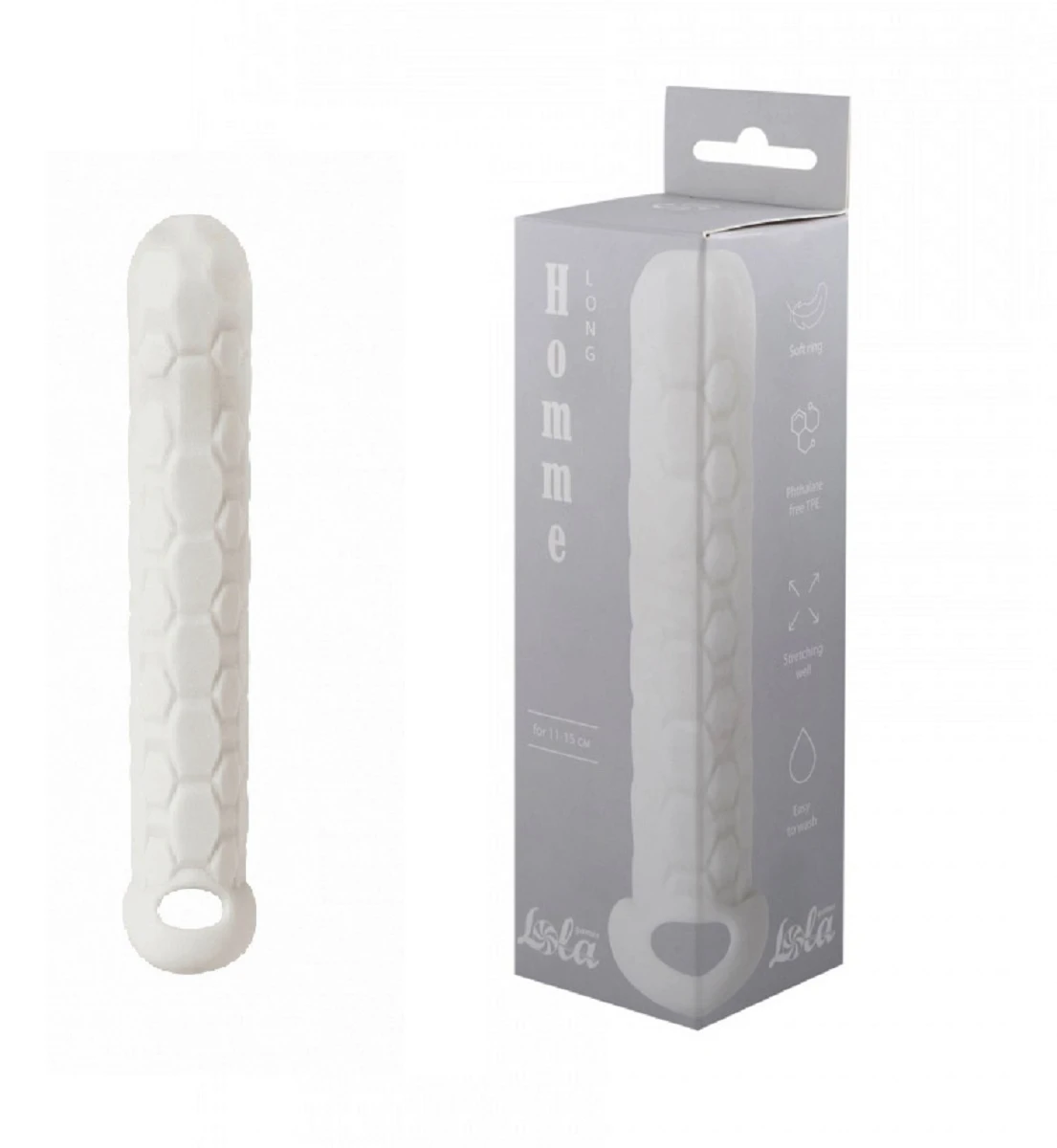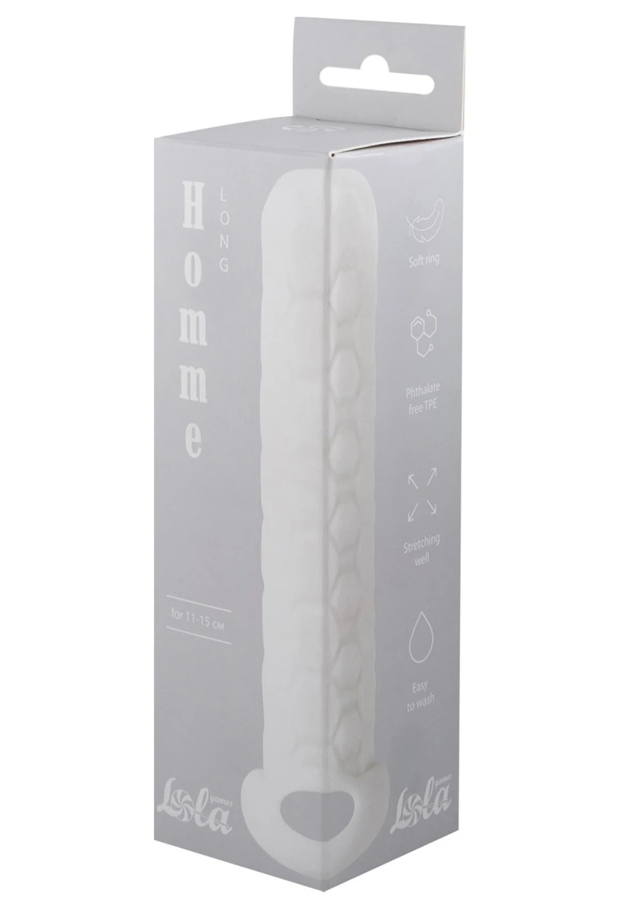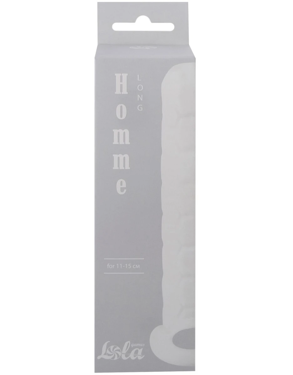 Насадка Long коллекции Homme обеспечивает увеличение размера пениса в длину. Материал насадки - гипоаллергенный, создающий имитацию мягкой и шелковистой кожи ТПЕ. Фиксирующее кольцо на мошонку не только удерживает фаллоудлинитель, но и благодаря сдавливанию может усиливать эрекцию. Двухсторонний нереалистичный рельеф насадки позволит одновременно стимулировать сразу обоих партнеров во время полового акта и дополнительно подарит приятные ощущения. Насадка оснащена встроенным удлинителем. Насадка отлично тянется, продлевает время интимной близости и компенсирует анатомическое несоответствие между партнерами. Материал ТПЕ. Размер: длина 15,5 см, длина внутреннего тоннеля 12,5 см, внешний диаметр 3,8 см, толщина стенки 5 мм. Цвет белый. Для более комфортного использования рекомендуем смазку на водной основе и очищающий спрей Clear Toy 100 мл.