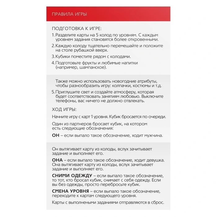 Проведите зимний праздник только вдвоём и подарите друг другу невероятное наслаждение. А наши карточки, включающие 5 уровней раскрепощения (от томных разговоров до пикантных поз для секса), в этом вам помогут. Очерёдность хода определит кубик. Разделите карты на 5 колод по уровням. С каждым уровнем задания становятся всё более возбуждающими. Бросайте кубик по очереди. Один из партнёров должен начать игру и бросить кубик, на котором есть определенные обозначения. Отложите скромность и предрассудки для более подходящего случая, ведь вам предстоит по-настоящему чувственная и заводная игра!
