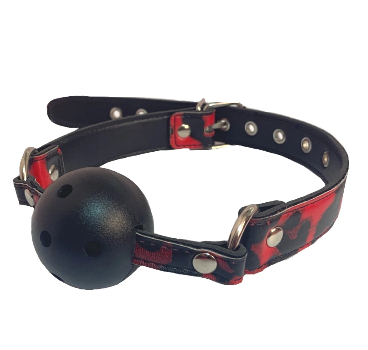 Кляп черного цвета из ABS пластика с дыхательными отверстиями, черный ремешок из искусственной кожи с красными полосками. Размер: длина 60 см, диаметр шара 4,5 см.