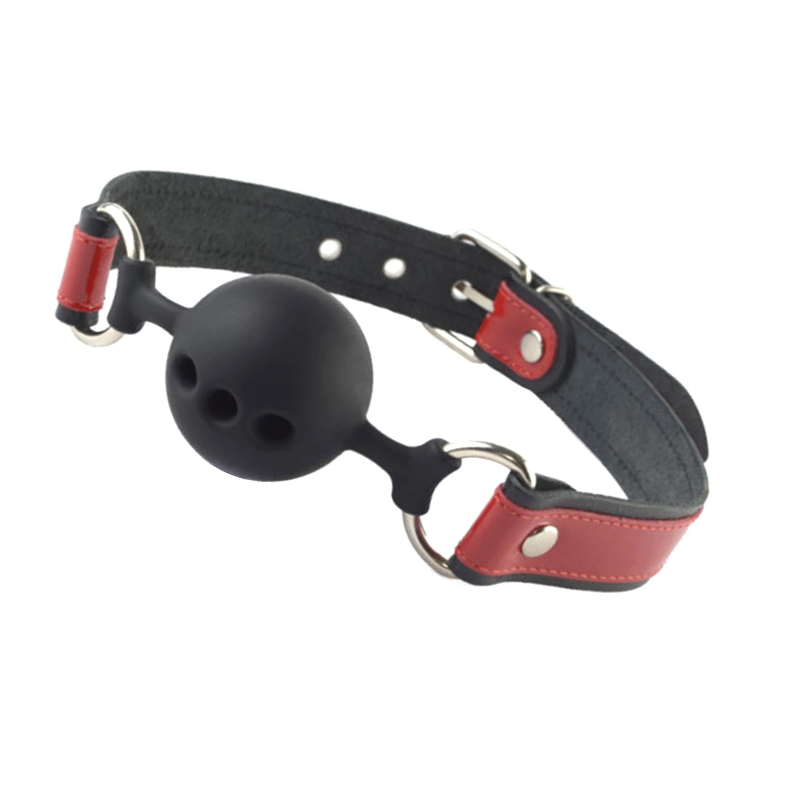 Кляп с оригинальным кожаным ремешком и лаковыми вставками красного цвета. Сам кляп-шар изготовлен из силикона, приятного на ощупь, со специальными отверстиями, пропускающими воздух. Ремешок с пряжкой позволяет подогнать изделие по желаемому размеру. Размер: длина 58 см, ширина ремешка 2,5 см, диаметр 4,4 см.