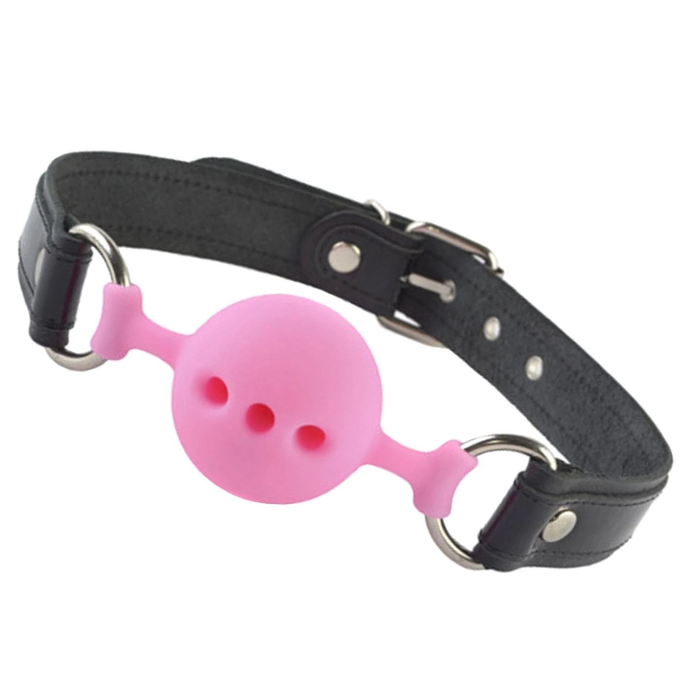Кляп с оригинальным кожаным ремешком и лаковыми вставками черного цвета. Сам кляп-шар изготовлен из силикона, приятного на ощупь, со специальными отверстиями, пропускающими воздух. Размер: длина 54 см, диаметр 4,4 см. Цвет шарика розовый, ремешок черный.