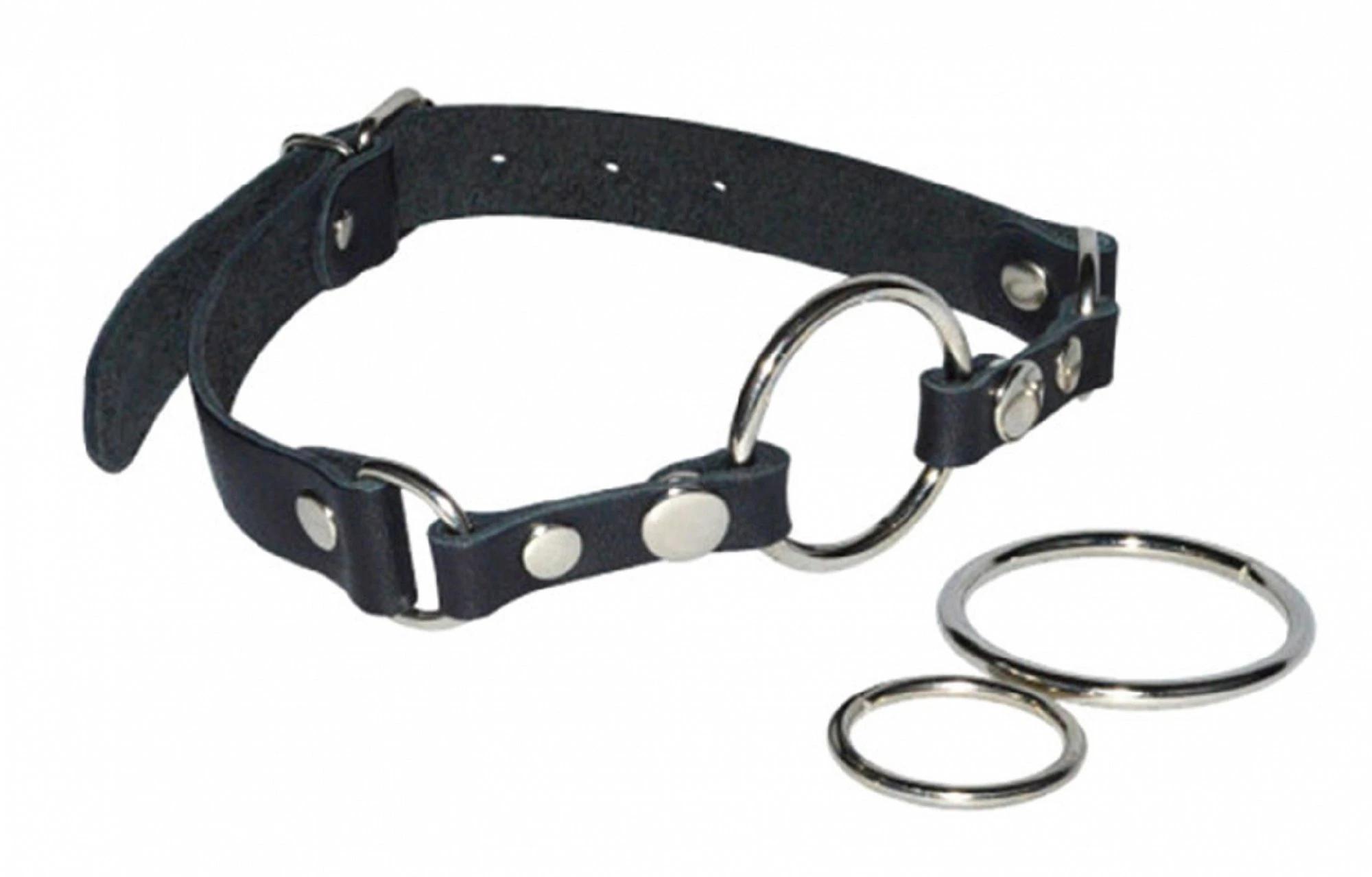 Кляп-рамка изготовлен из натуральной высококачественной кожи чёрного цвета. Особенностью данного девайса, являются сменные кольца, которые легко отстегнуть при помощи кнопок. Внешний диаметр колец: 38 мм, 44 мм, 59 мм. Зафиксировать и отрегулировать изделие можно при помощи металлической пряжки. Вся металлическая фурнитура имеет никелевое покрытие.