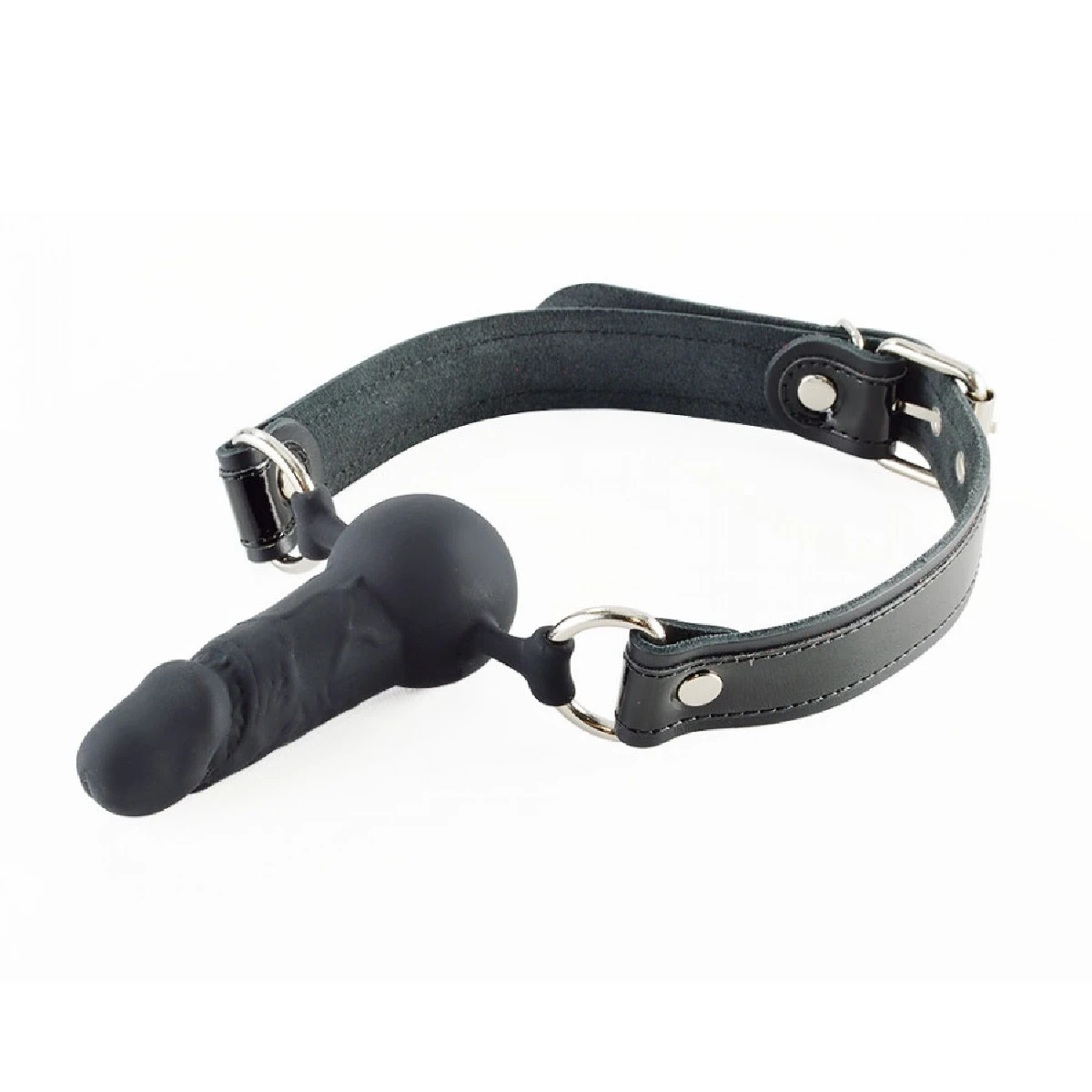Кляп страпон с кожаным ремешком черного цвета. Сам кляп шарик с фалосом изготовлен из силикона, приятного на ощупь. Ремешки из натуральной кожи декорированы лаковой вставкой с пряжкой позволяют подогнать изделие по желаемому размеру. Размер: длина 54 см, ширина ремешка 2,5 см, диаметр шара 3,8 см, рабочая длина фалоса 6,5 см, диаметр 2,5 см. Цвет черный.
