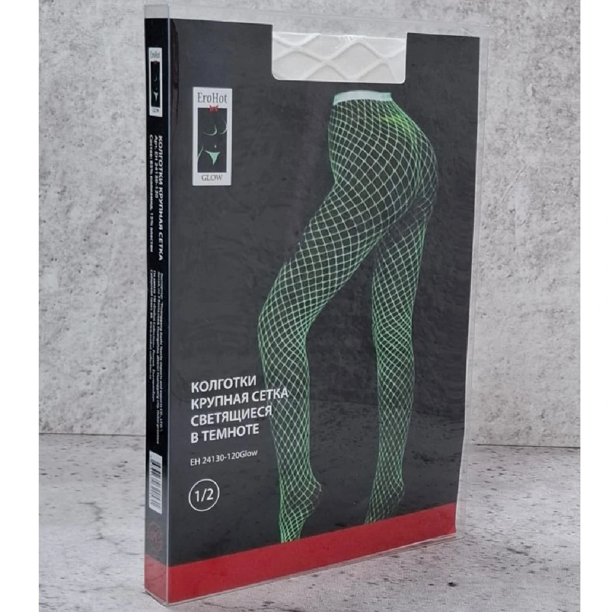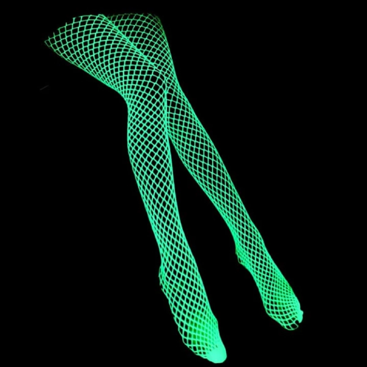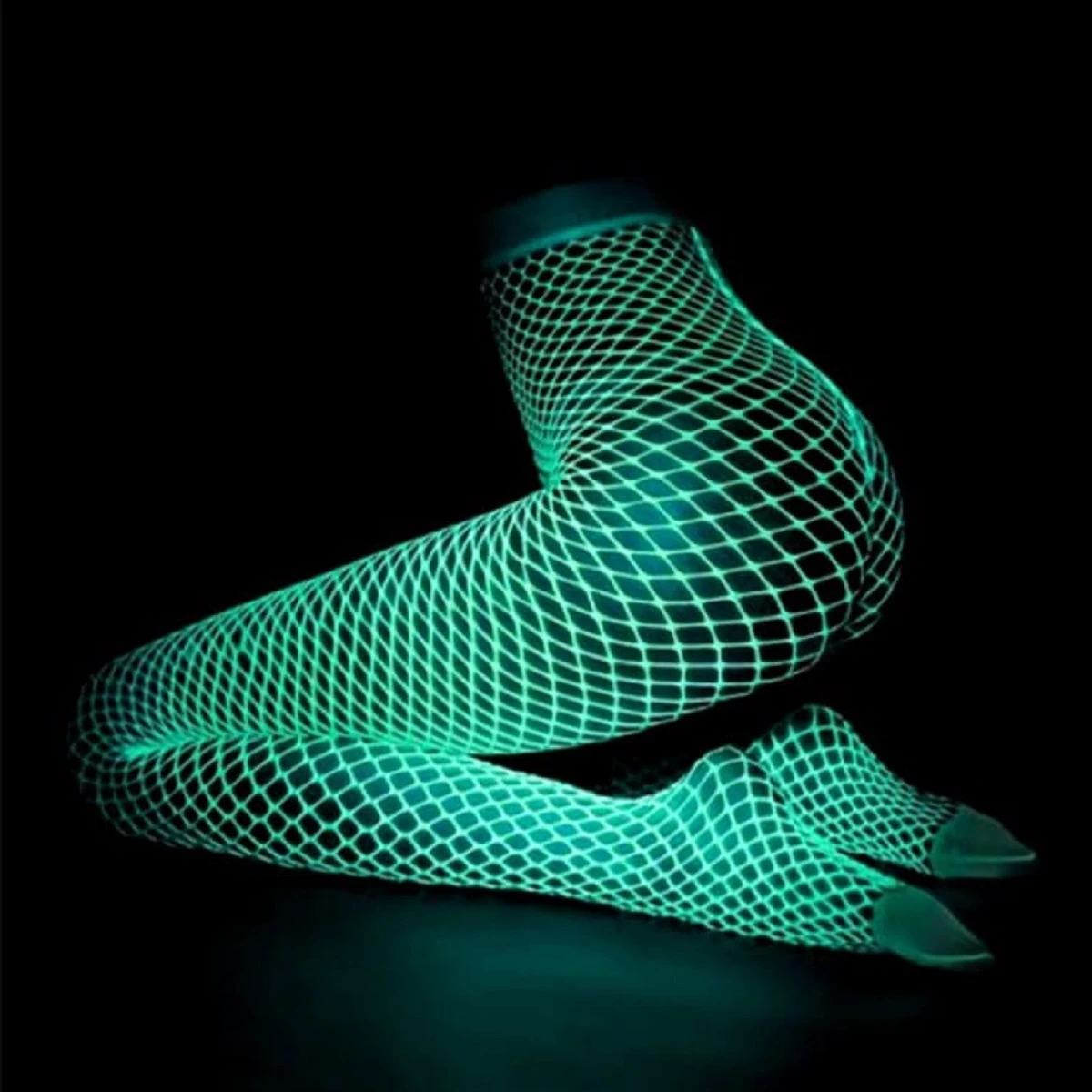 Классические колготки в крупную сетку выгодно подчеркнут стройность женских ножек. При дневном цвете изделие имеет белый цвет, в темноте меняет на флуоресцентный зелёный. Светящиеся в темноте изделия необходимо зарядить солнечным светом несколько часов, прежде чем наслаждаться ими в темноте. Размер: 1/2.