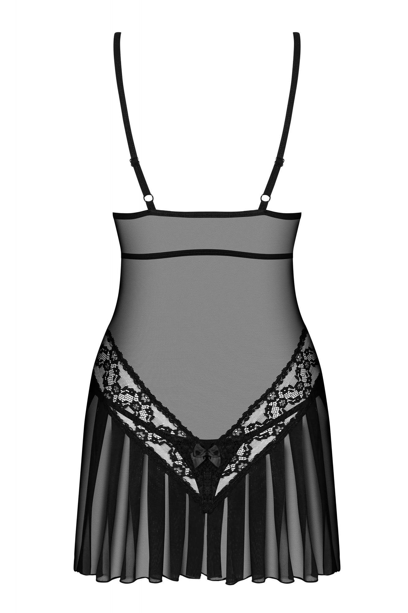 Сорочка выполнена из мягкой прозрачной ткани и украшена кружевом. Кружевные чашки мягкие, без косточек, сверху украшены рюшами. Бретели регулируются по длине - идеальная подгонка под себя. Очаровательная спинка сорочки - кокетливые складки на ягодицах. В комплекте миниатюрные стринги с хлопковой ластовицей. Цвет: черный. Размер: S/M.