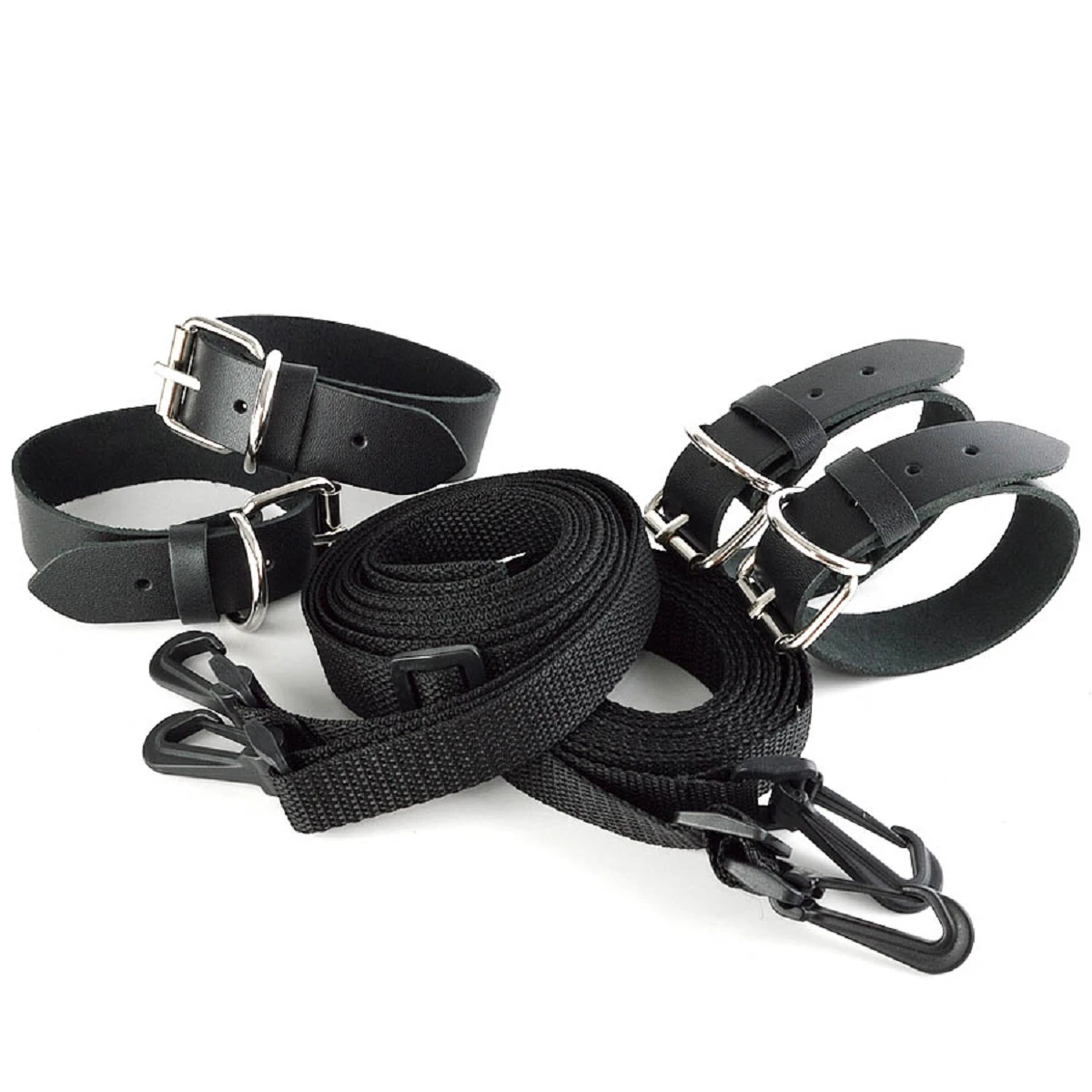 В комплект входят наручники, оковы и две растяжки на кровать. Длина каждого ремешка 2,7 м. Наручники и оковы из натуральной кожи крепятся к ремешкам при помощи прочных пластиковых карабинов. Цвет черный.