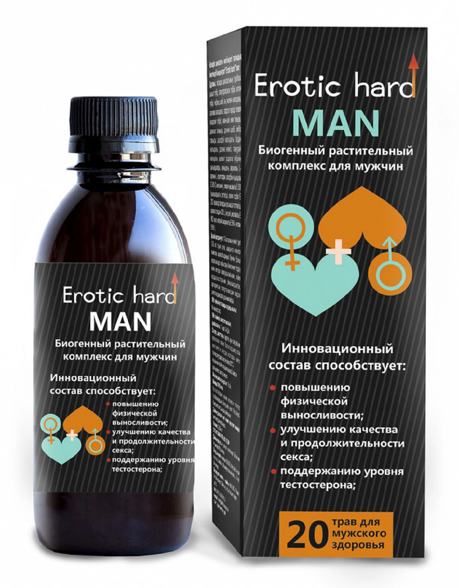 Биогенный концентрат Erotic hard MAN, возбуждающее средство растительного происхождения для мужчин. Состав разработан российскими учеными. Это уникальное сочетание современной науки и народных рецептов оздоровления. Богатейший состав экстракта из 20 растений, L-аргинина и L-триптофана благодаря высокому содержанию в них гликозидов, флавоноидов, каротиноидов, витаминов, минералов, особенно важных для мужской силы витамина Е и цинка, дубильных, слизистых и других веществ. Назначение:Мужчинам для повышения либидо, сексуальности, физической выносливости, увеличения продолжительности полового акта, профилактики воспалительных и инфекционных заболеваний мочеполовой системы, поддержания уровня тестостерона и репродуктивной функции, улучшения настроения, работоспособности и уменьшения депрессивных состояний.