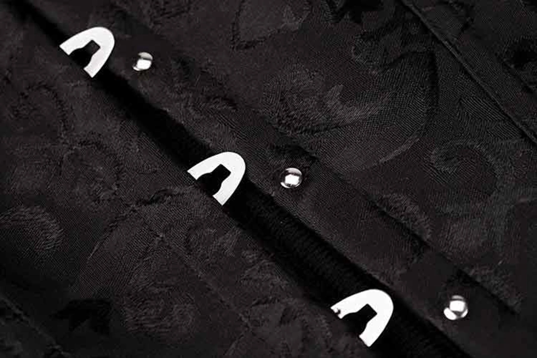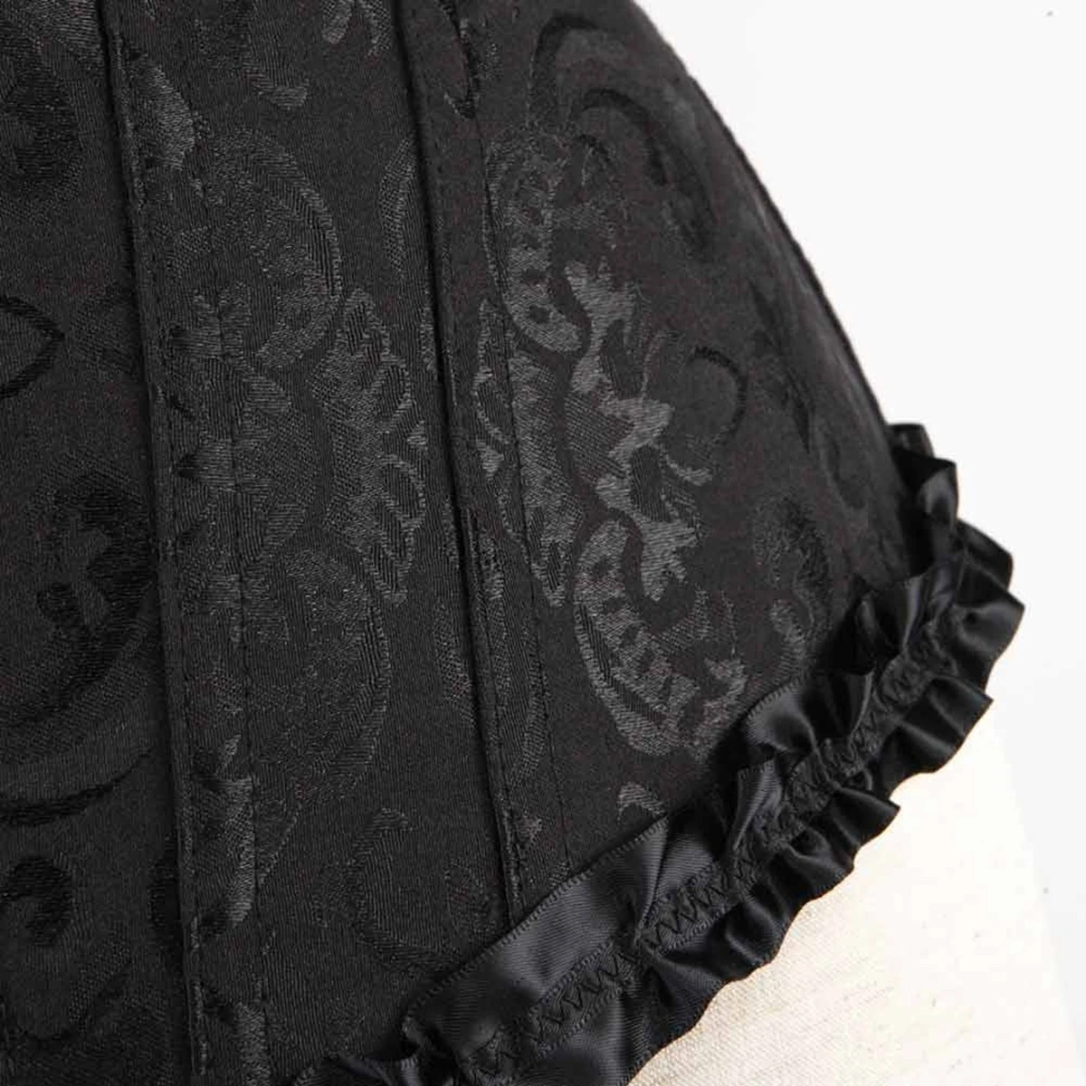 Эффектный черный корсет из жаккардовой ткани с цветочным с рисунком. Спереди застегивается на крючки, а на спинке - регулируемая шнуровка. Дкорирован рюшами и бантиком. В комплекте трусики-стринги. Состав: 82% спандекс, 18% нейлон. Цвет черный. Размер L.