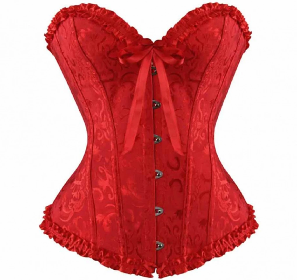 Эффектный красный корсет из жаккардовой ткани с цветочным с рисунком. Спереди застегивается на крючки, а на спинке - регулируемая шнуровка. Дкорирован рюшами и бантиком. В комплекте трусики-стринги. Состав: 82% спандекс, 18% нейлон. Цвет красный. Размер M.