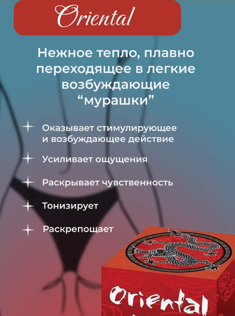 Крем ORIENTAL с охлаждающе-разогревающим эффектом для наружного применения, вызывающий ощущения то холода, то тепла, в упаковке для однократного применения. Способ применения: нанесите на нужную зону и плавно массируйте круговыми движениями. ВНЕШНЕЕ ИСПОЛЬЗОВАНИЕ. Меры предосторожности: Храните в недоступном для детей месте. Избегать контакта с глазами. Хранить в сухом и проветриваемом месте. Состав: кетостеариловый спирт, стеариновая кислота, глицерин, кокамидопропил бетаин, феноксиэтанол, метилисотиазолинон, моноэтаноламин, жидкий парафин, динатрия эдетат, бутил-гидрокситолуол, вода, этиловый спирт, ментол.