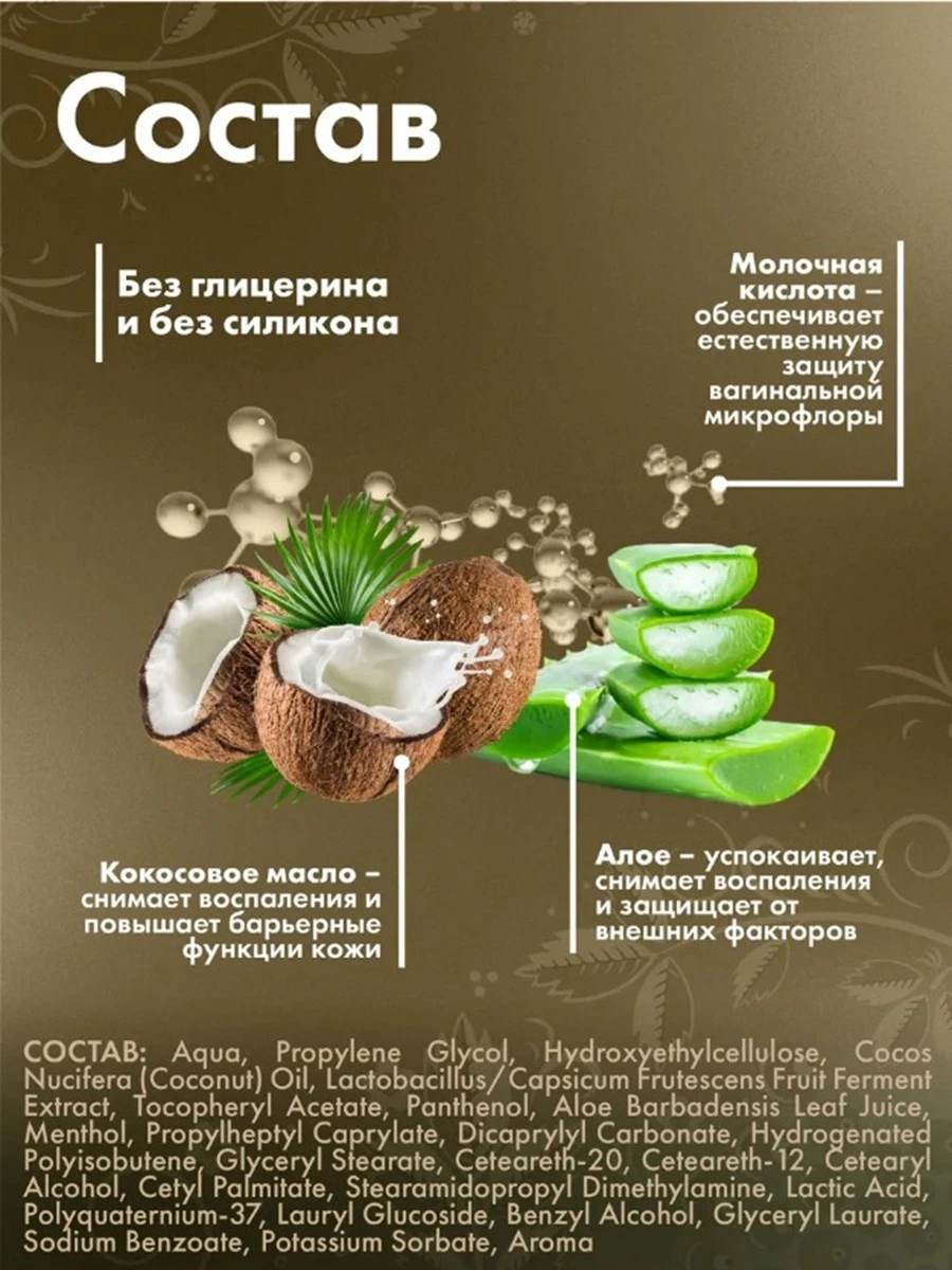 Гибридный лубрикант на водной основе с добавлением кокосового масла. Обеспечивает гладкое и длительное скольжение и интенсивное увлажнение. Обладает шелковистой текстурой и приятным ароматом. Благодаря интенсивному увлажнению, легко устранит неприятные ощущения во время близости, повысит чувствительность и поможет получить максимальное удовольствие. Идеально сочетается со средствами контрацепции (презервативами) не вызывает натирания. Легко смывается водой, не оставляя ощущения липкости. Безопасен для применения с резиной и латексом, а также с устройствами призванными обострить и разнообразить сексуальные отношения. Нанести на половые органы или внешнюю сторону используемого презерватива. После полового акта желательно смыть гель-смазку теплой водой с мылом. Объем: 200 мл.