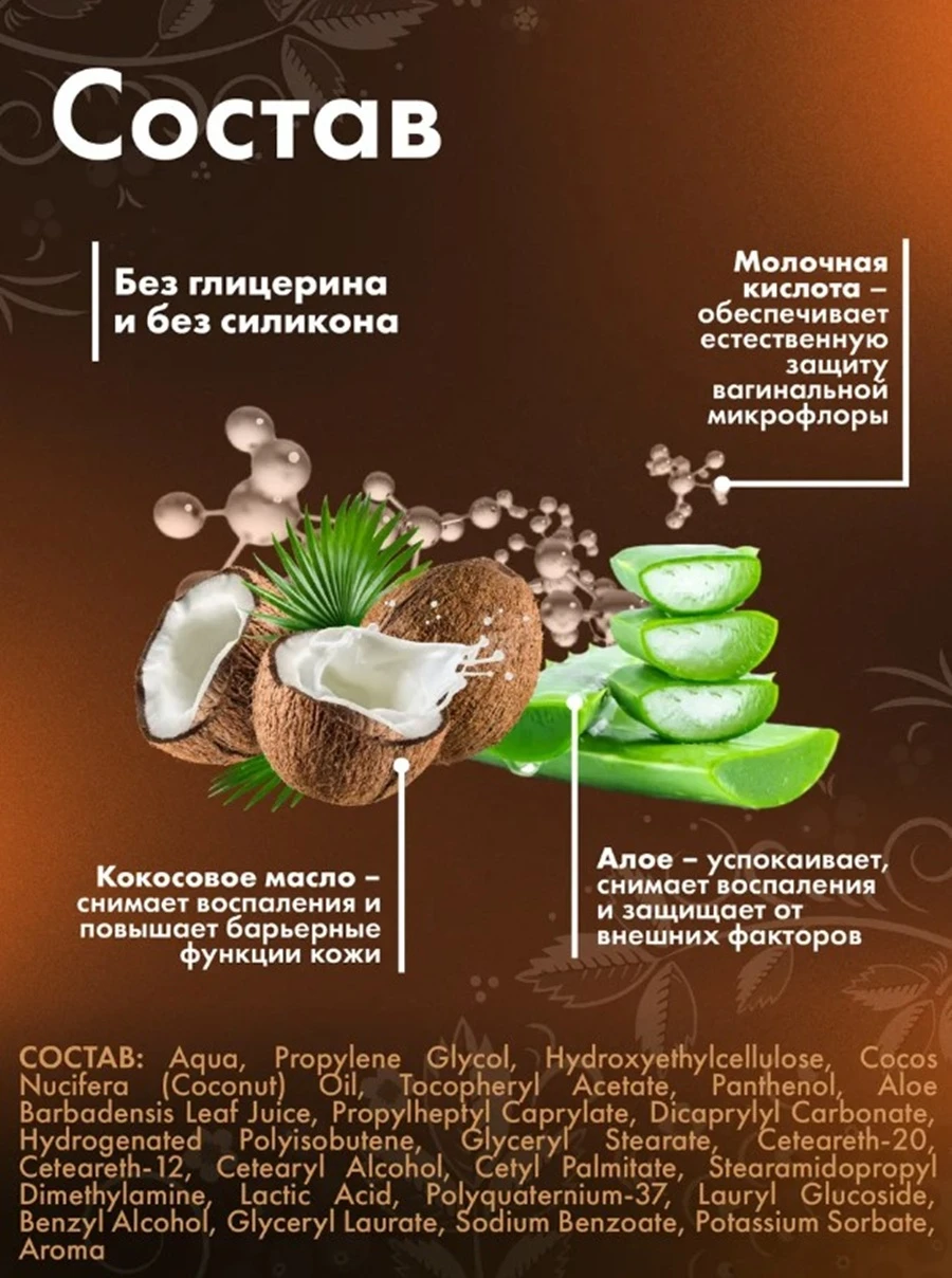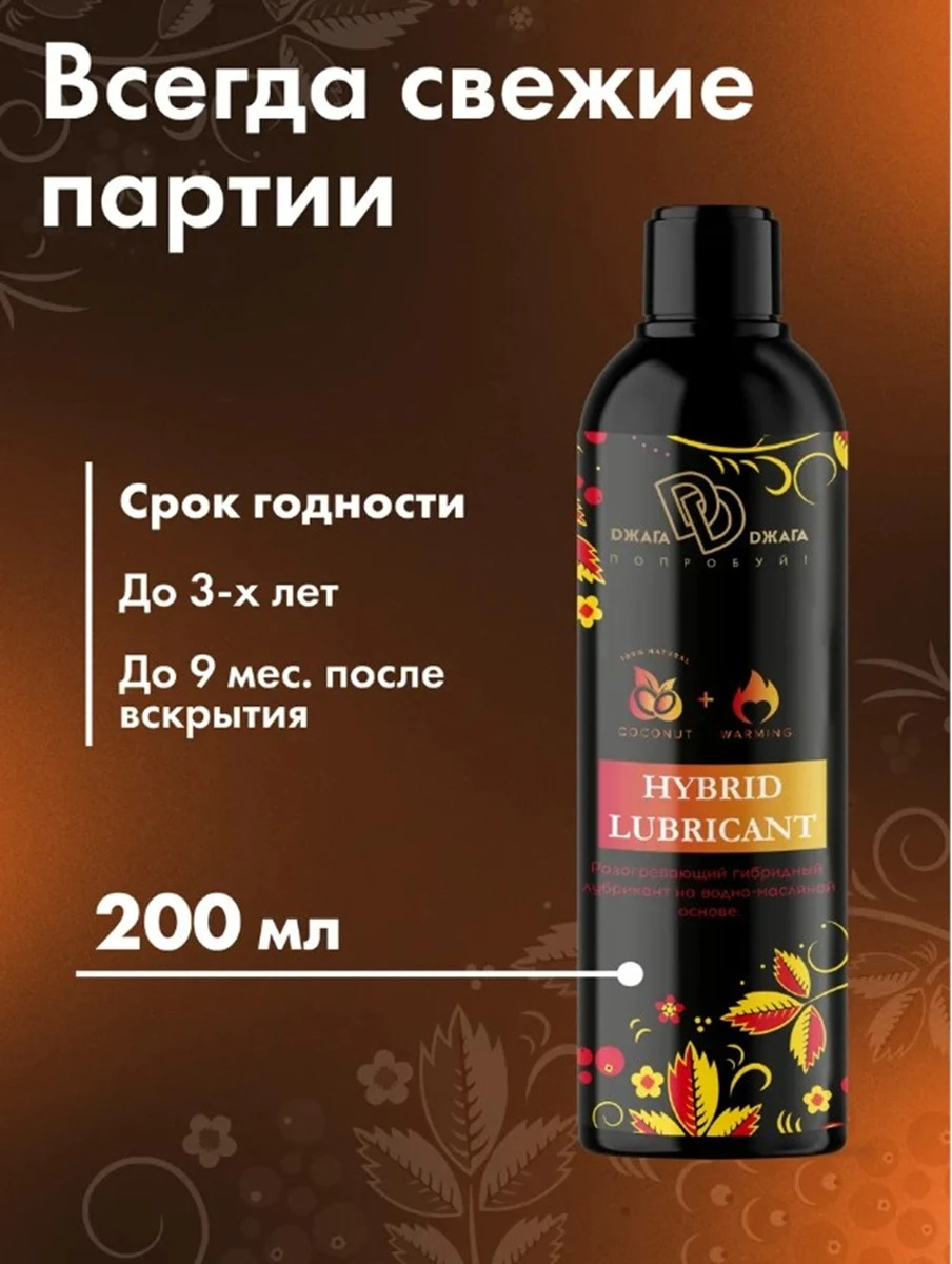 Разогревающий гибридный лубрикант на водной основе с добавлением кокосового масла. Обеспечивает возбуждающий эффект и интенсивное увлажнение. Обладает шелковистой текстурой и приятным ароматом. Благодаря интенсивному увлажнению, легко устранит неприятные ощущения во время близости, повысит чувствительность и поможет получить максимальное удовольствие. Идеально сочетается со средствами контрацепции (презервативами) не вызывает натирания. Легко смывается водой, не оставляя ощущения липкости. Безопасен для применения с резиной и латексом, а также с устройствами призванными обострить и разнообразить сексуальные отношения. Нанести на половые органы или внешнюю сторону используемого презерватива. После полового акта желательно смыть гель-смазку теплой водой с мылом. Объем: 200 мл.