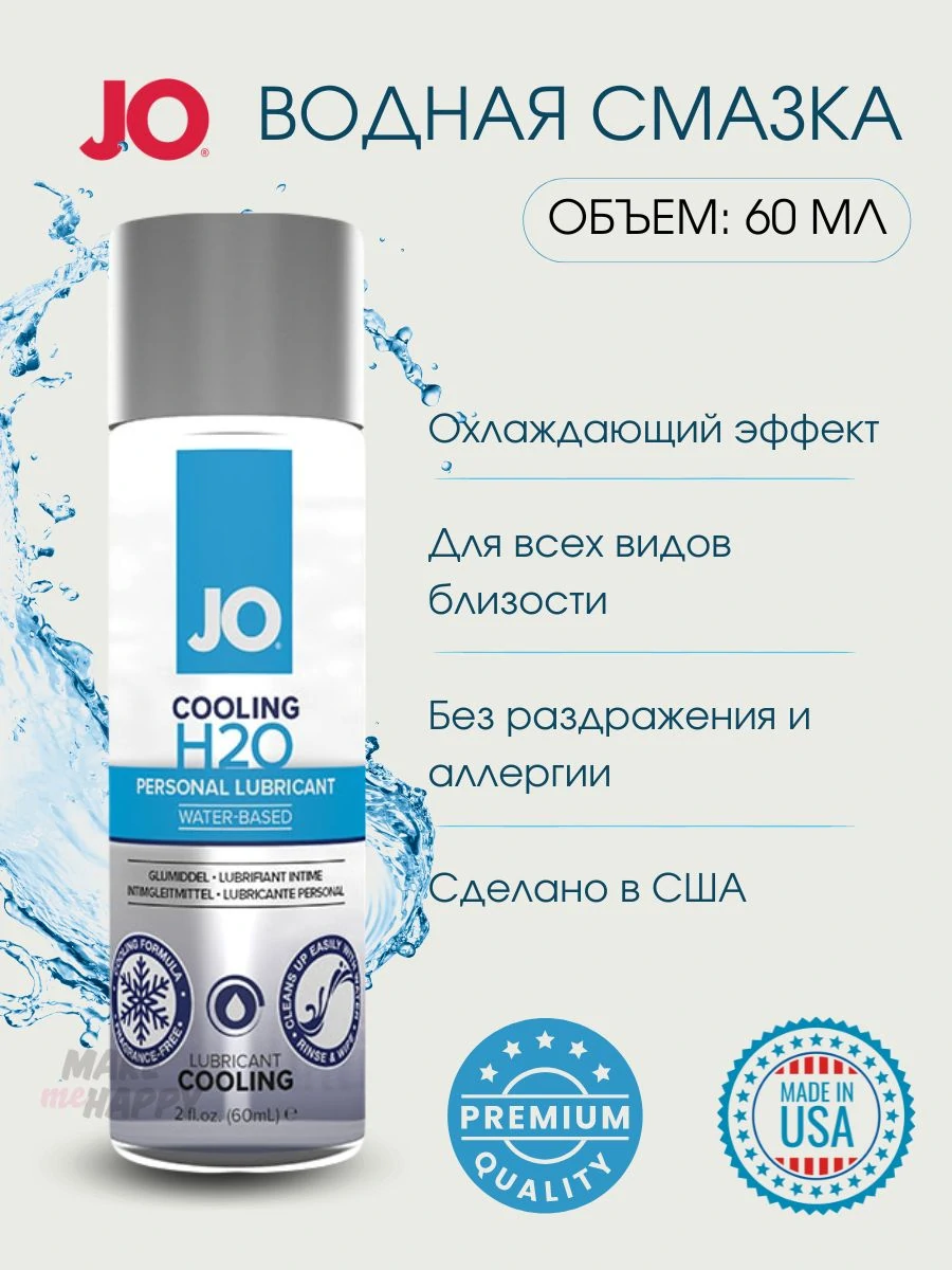 Охлаждающий лубрикант на водной основе JO H2O Cool - превосходное длительное скольжение без липкости и без скатываний. Без искусственных добавок. Нежный как силиконовый. Охлаждающий эффект создает легкие возбуждающие мурашки и делает прикосновение тел более желанным и контрастным, не жертвуя, ни одним из качеств JO. Обладает всеми преимуществами фаворита JO H2O, который заставит вас возвращаться к нему снова и снова. Применение: небольшое количество персонального любриканта, нанесите на интимные участки. Для использования с презервативом, нанесите на наружную сторону презерватива.
